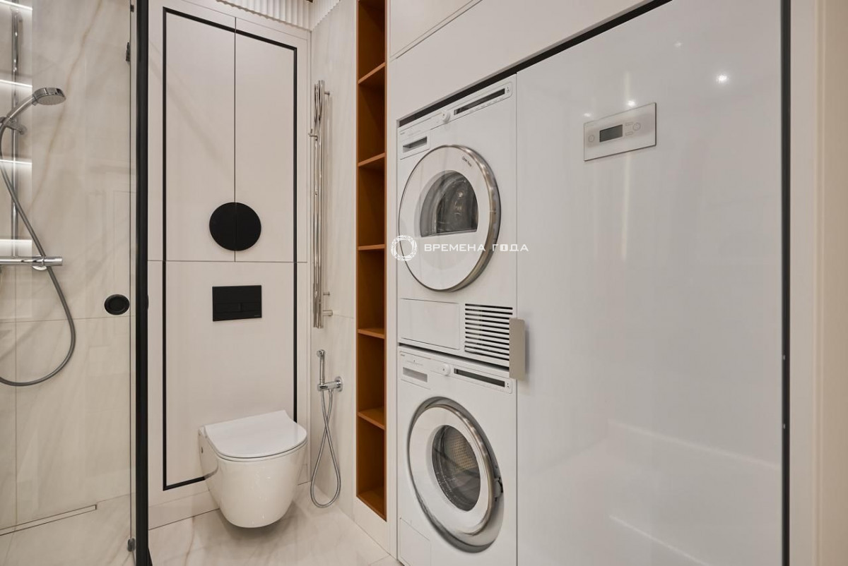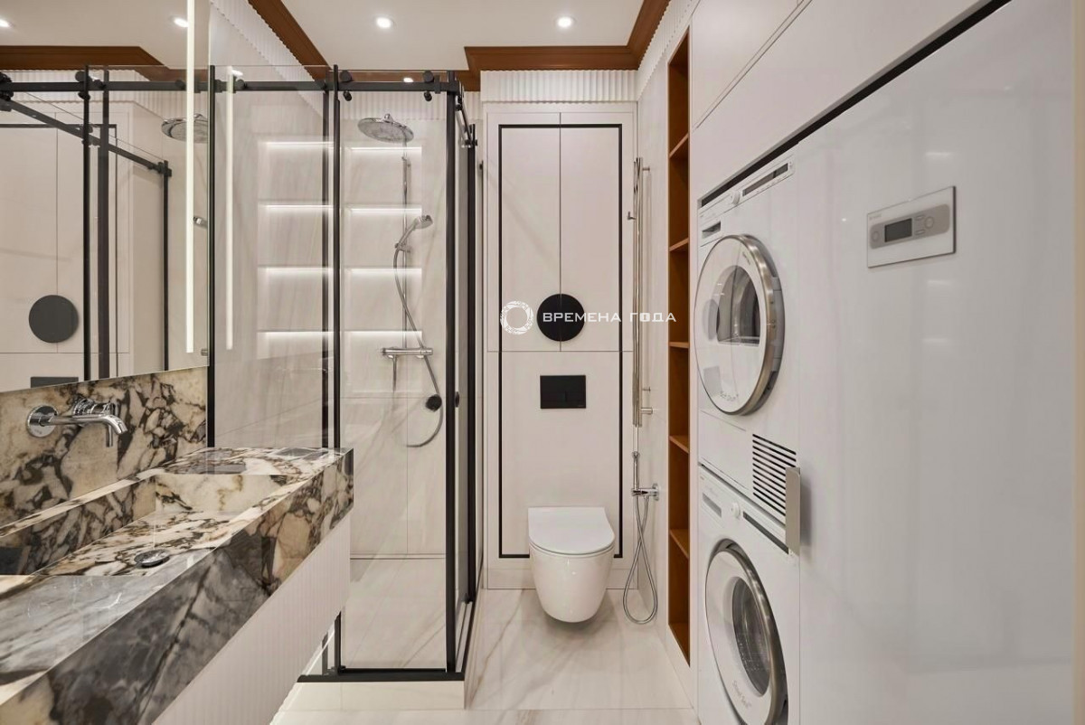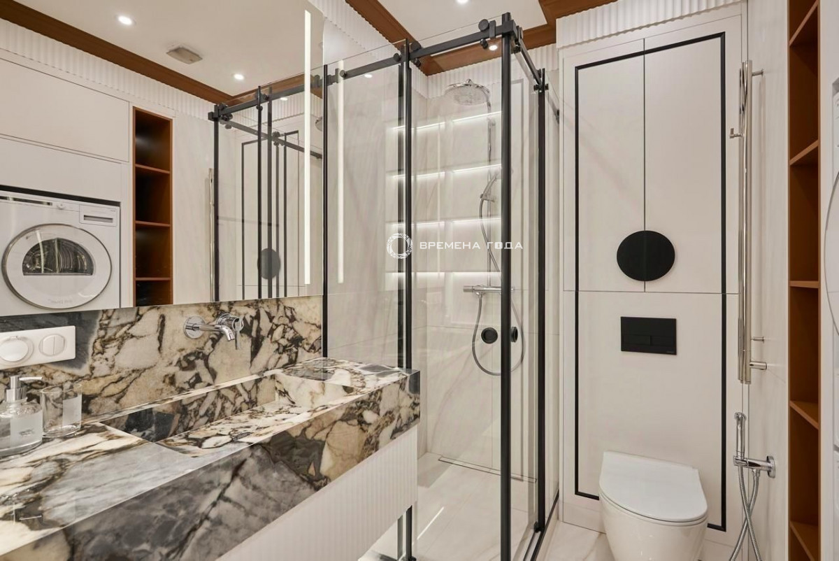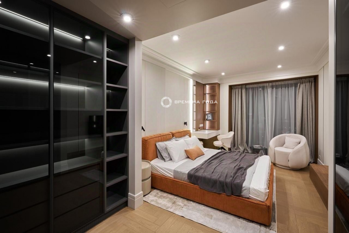 Планировочное решение: кухня с обеденной зоной и гостиной, мастер-спальня со своим гардеробом и совмещенным санузлом с ванной и душевой кабиной. спальня с гардеробной зоной, кабинет, второй санузел с постирочной, две гардеробные, холл.