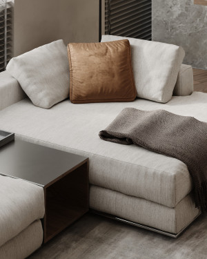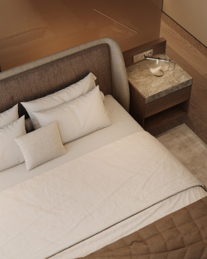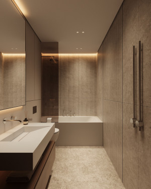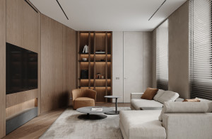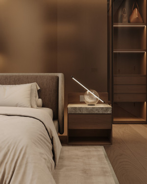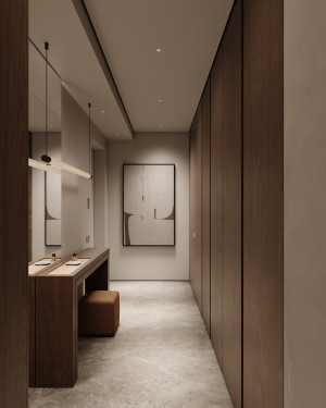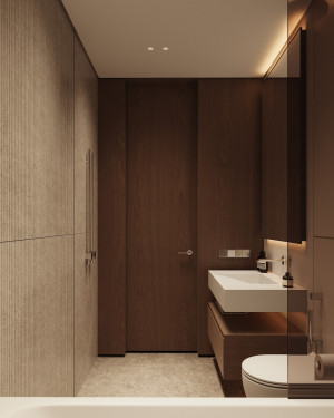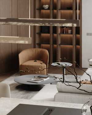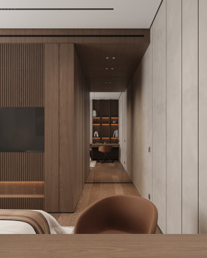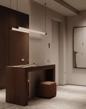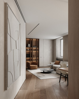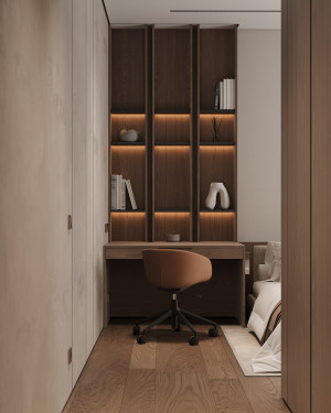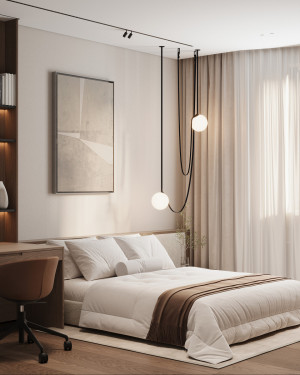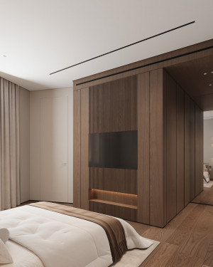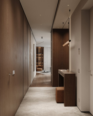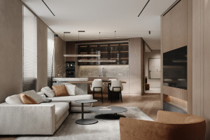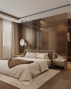Планировочное решение: кухня, гостиная с обеденной зоной, спальня, детская комната с лоджией, два санузла и гардеробная комната.
