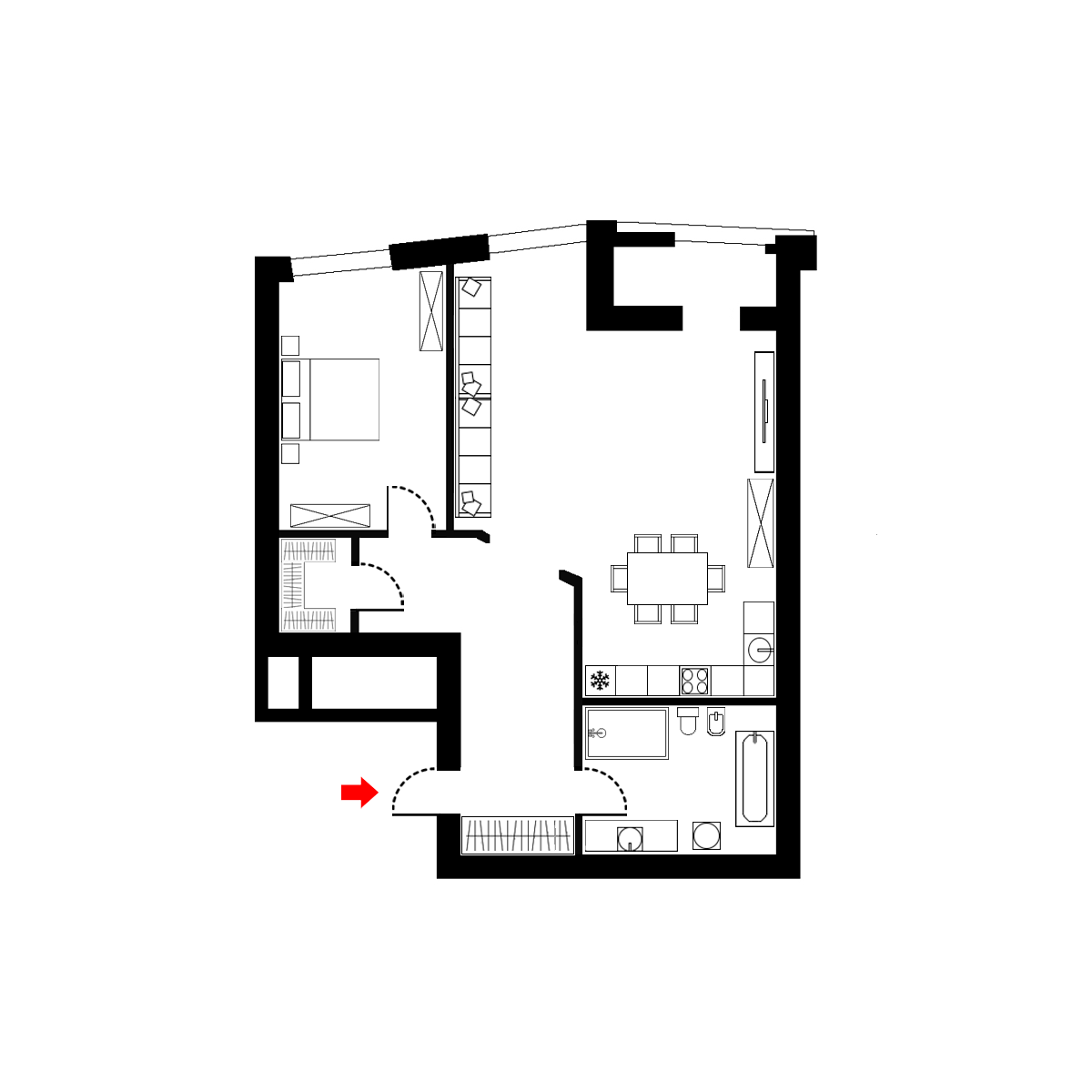 Планировочное решение: кухня с обеденной зоной и гостиной, спальня гостевой санузел, гардеробная комната при входе, холл.