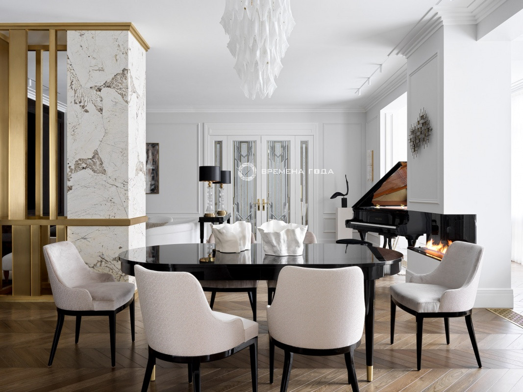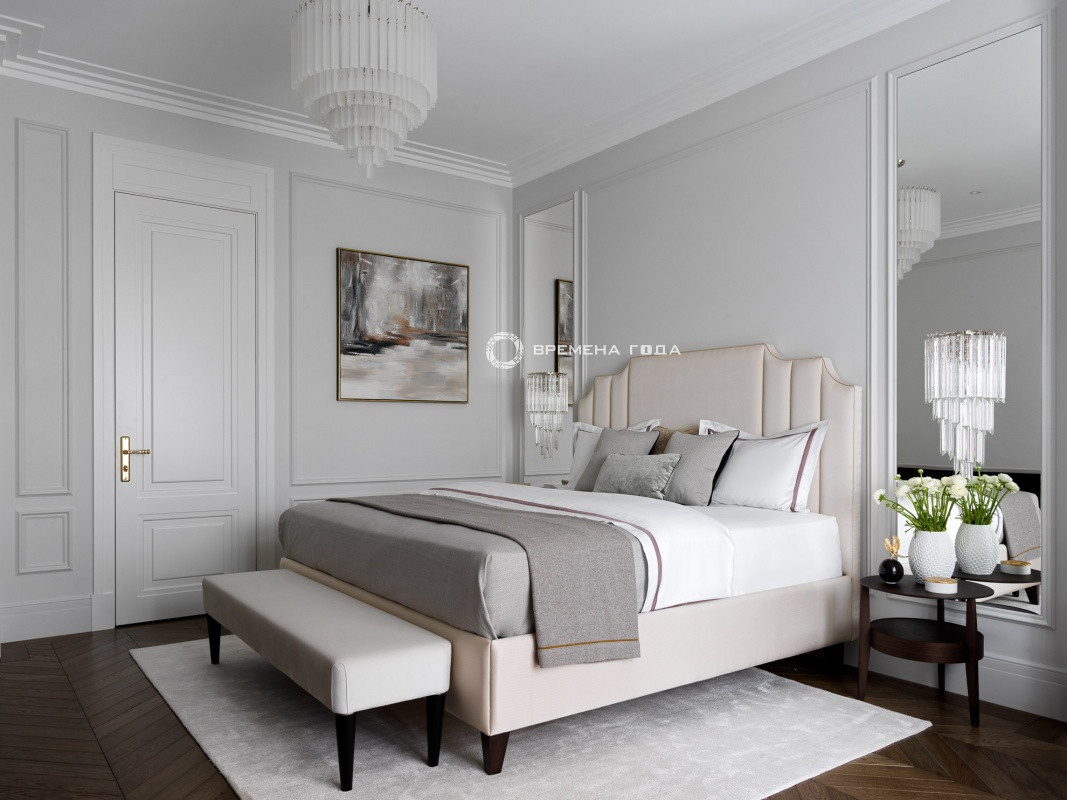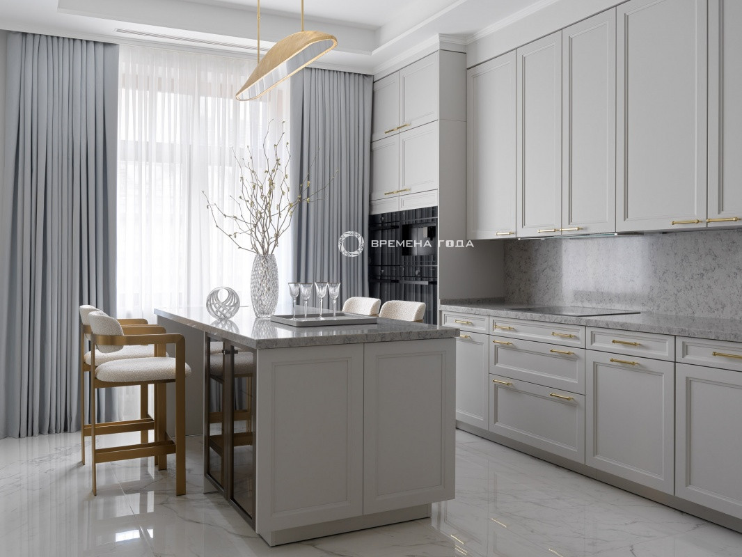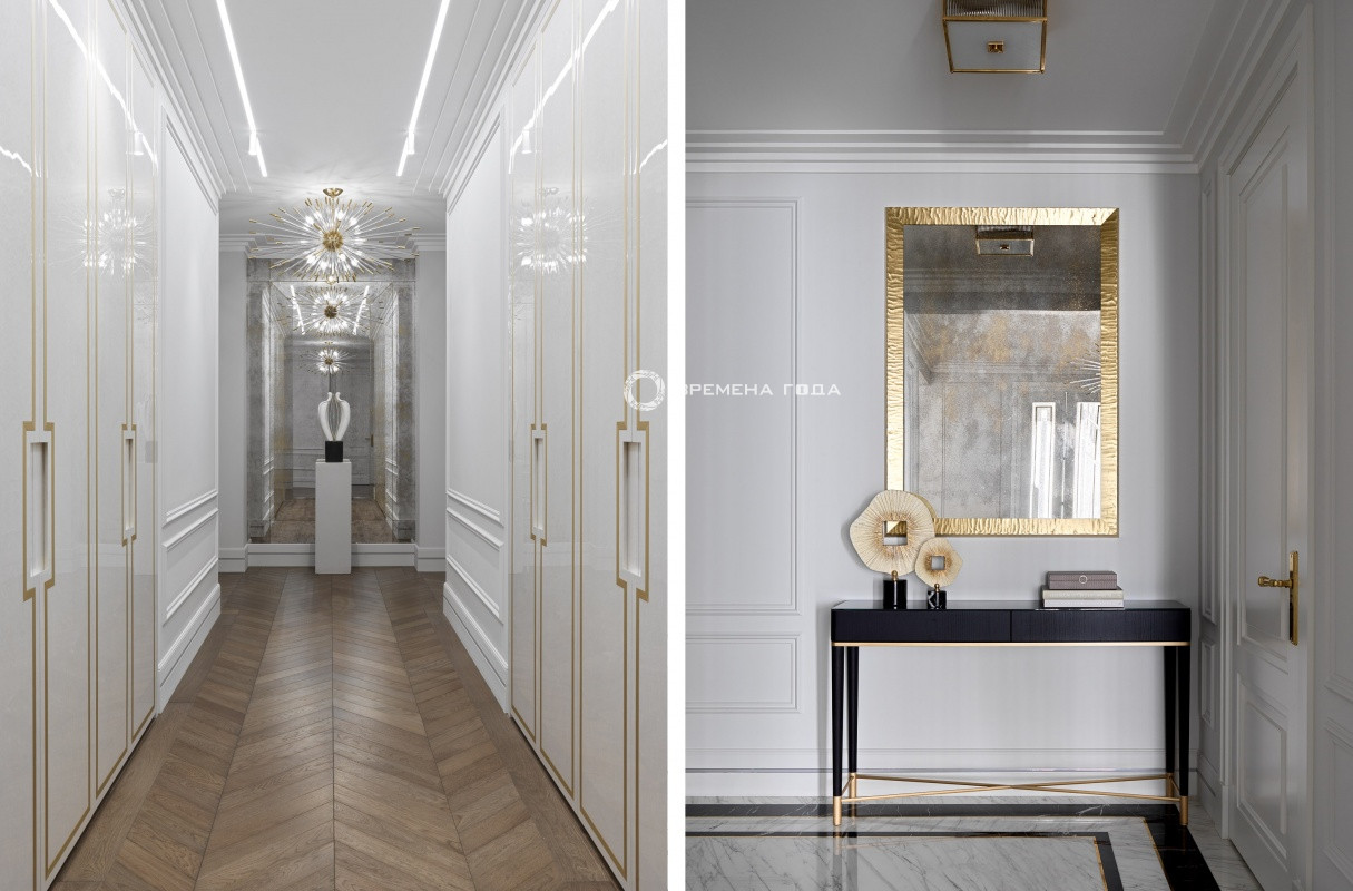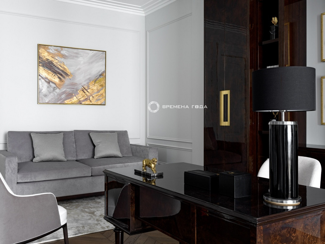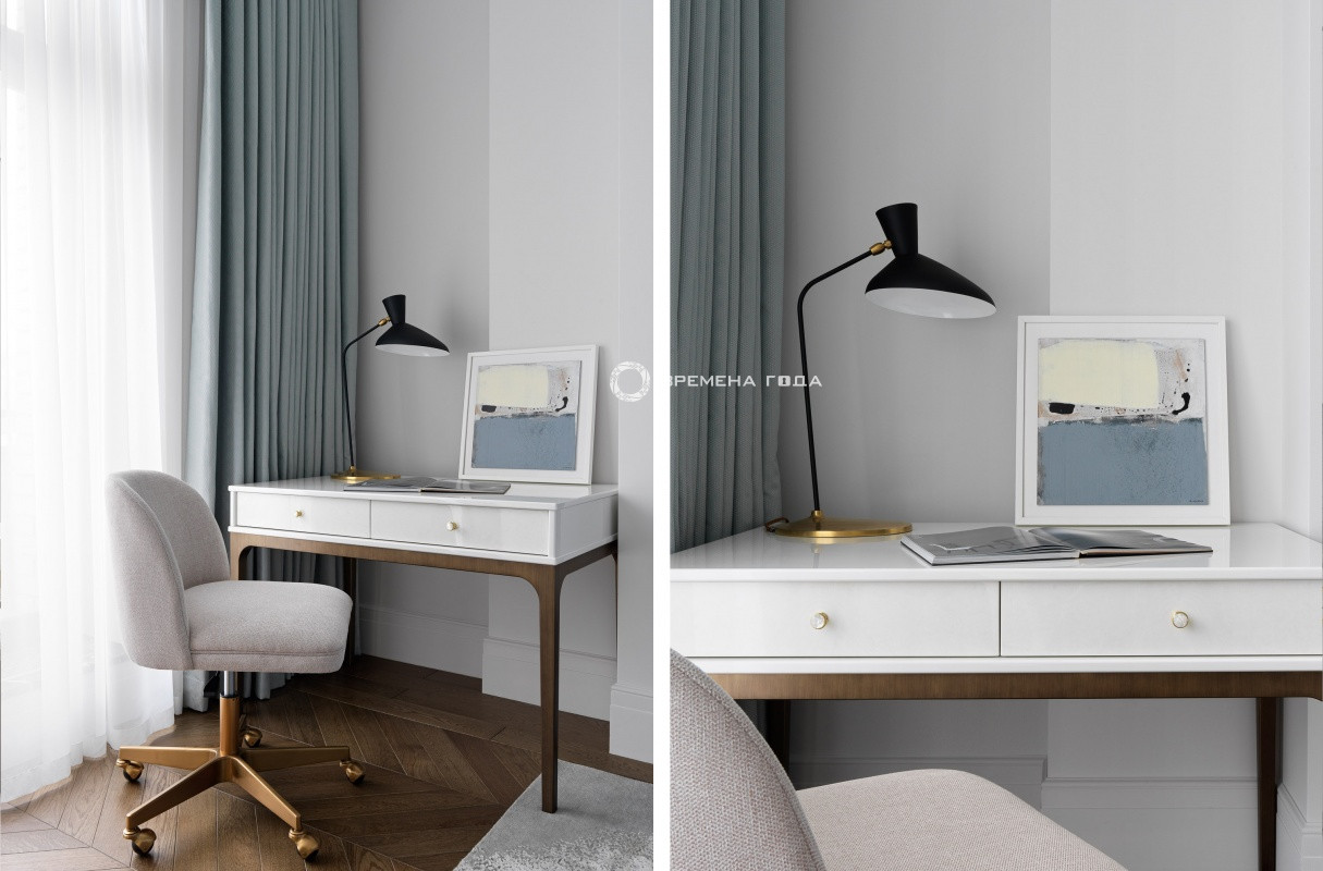 Планировочное решение: кухня-столовая, гостиная, кабинет, две спальные комнаты со своими с/у и гардеробными, гардеробная, холл.