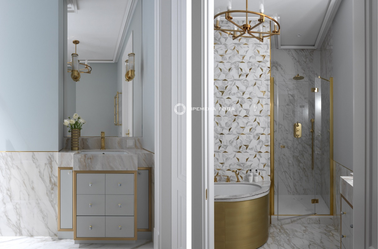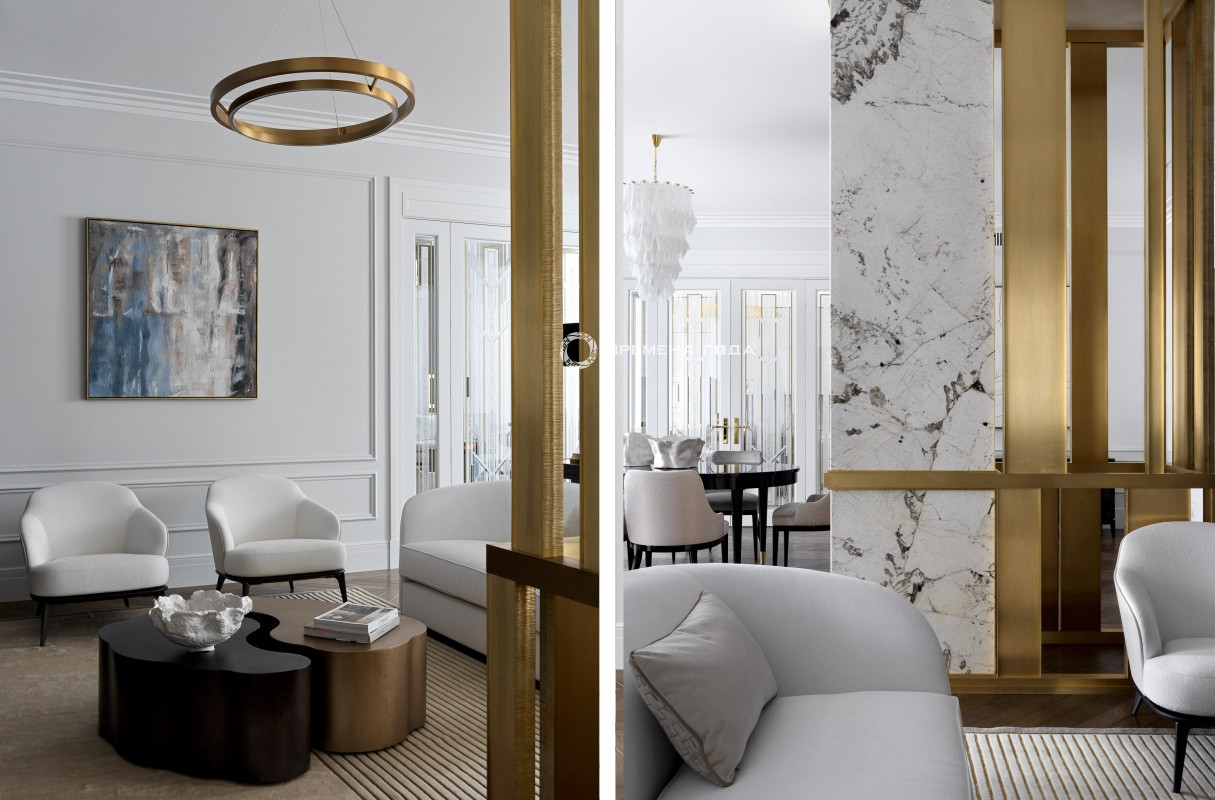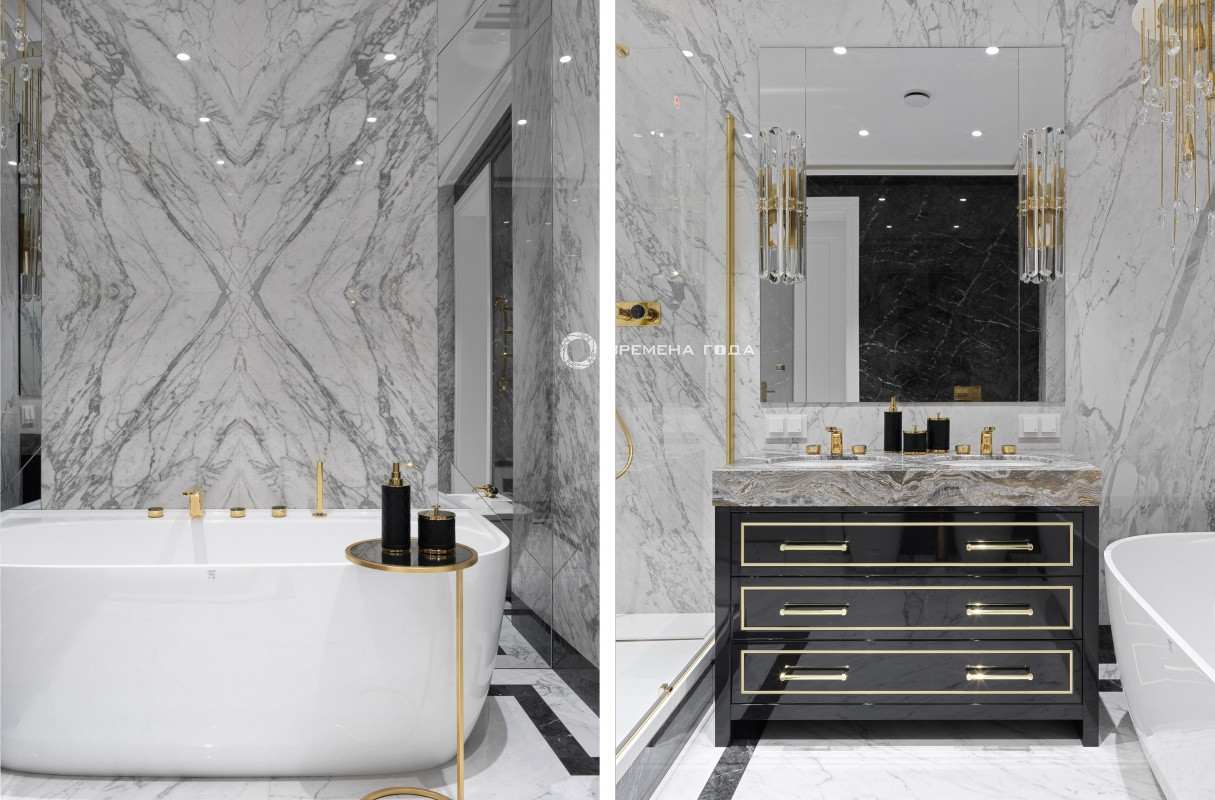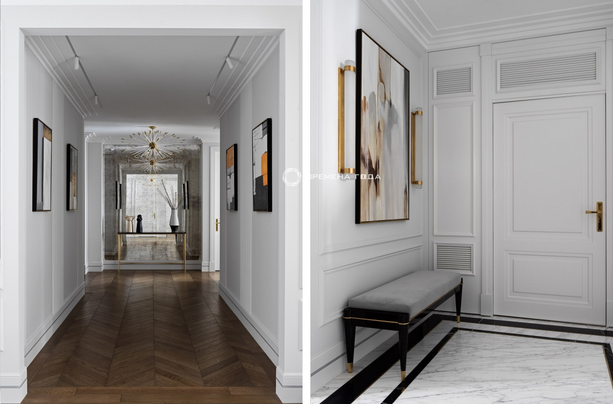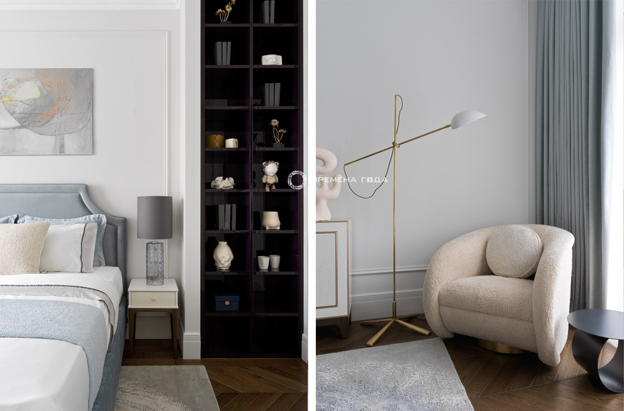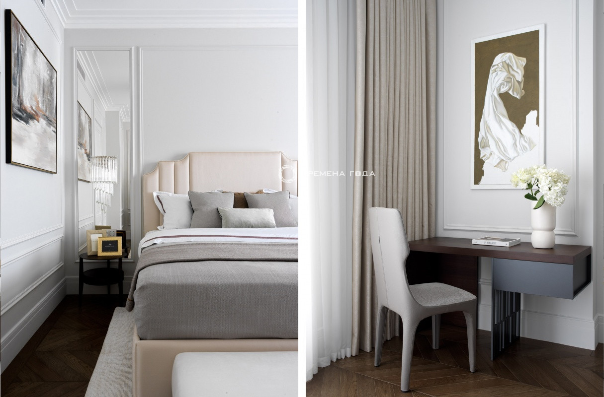 Планировочное решение: кухня-столовая, гостиная, кабинет, две спальные комнаты со своими с/у и гардеробными, гардеробная, холл.