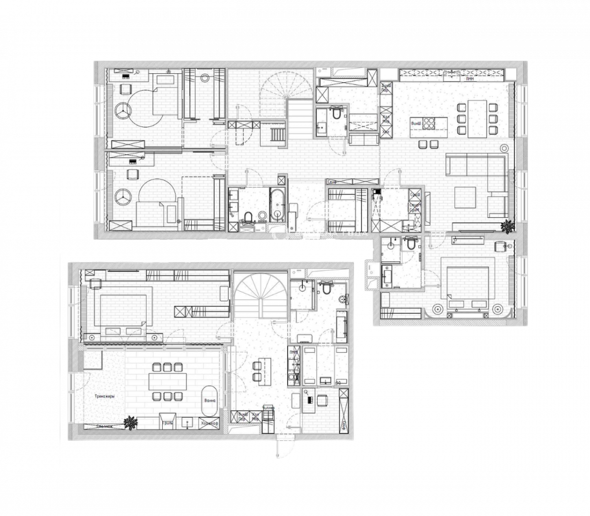 1 уровень: кухня с обеденной зоной и гостиной, мастер-спальня со своим санузлом и гардеробной комнатой, две спальни со своими гардеробными комнатами, два санузла, постирочная, кладовая, гардеробная комната, холл