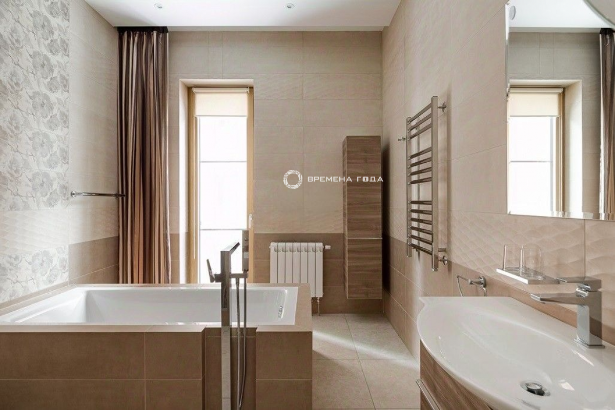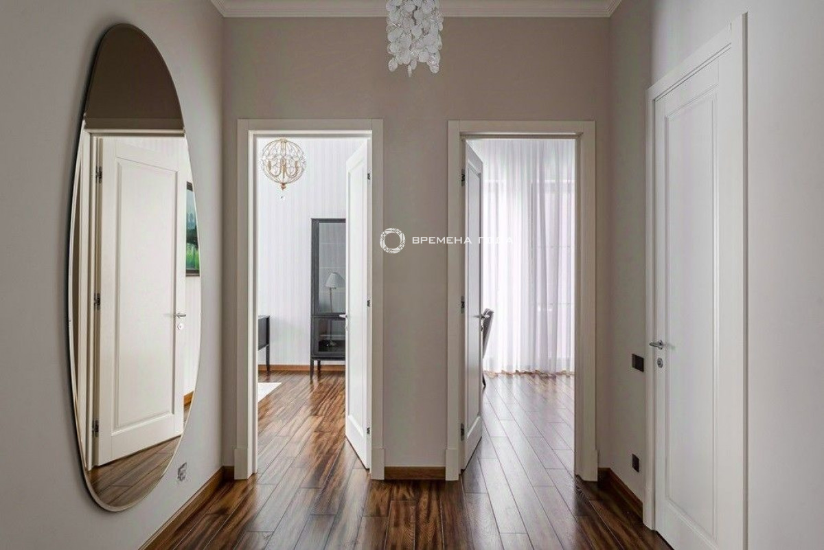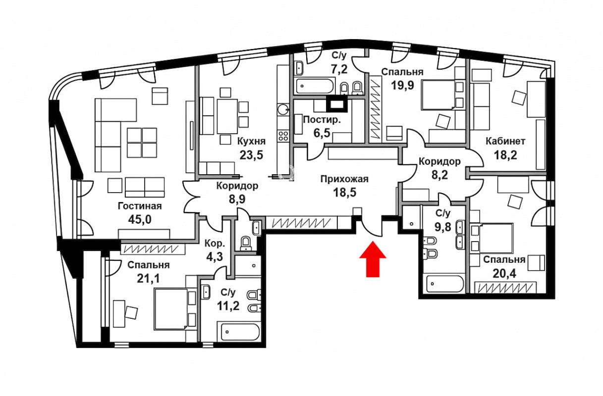 Планировочное решение: кухня-столовая, гостиная, две спальные комнаты со своими санузлами, изолированная спальня, кабинет, постирочная, холл, два санузла.