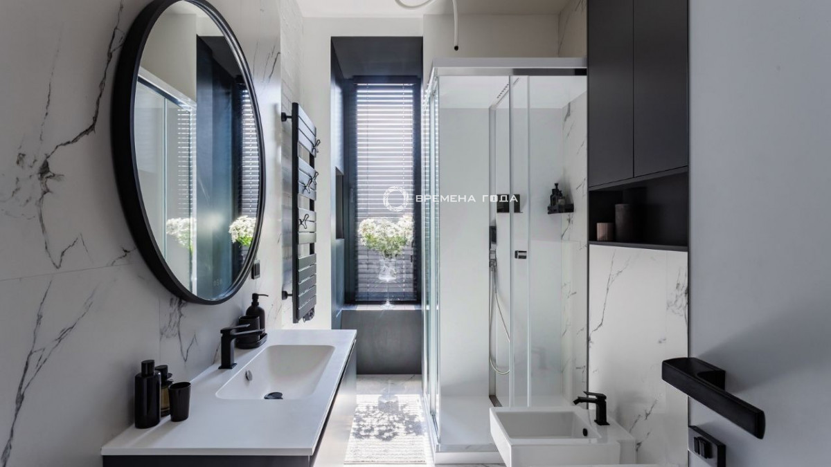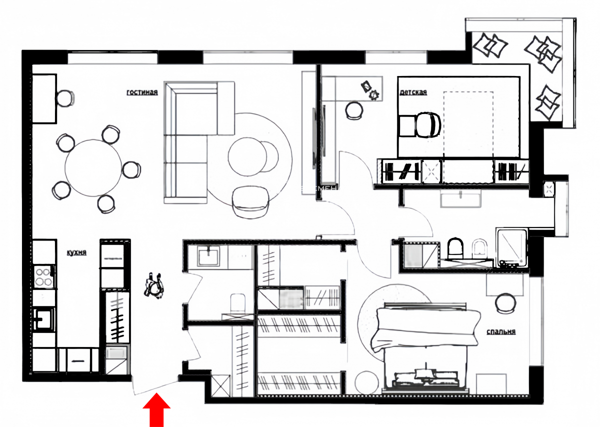 Планировочное решение: кухня-столовая-гостиная, две спальни, 3 с/у, 2 гардеробные.