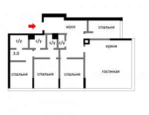 Возможный вариант планировки: кухня с обеденной зоной и гостиной, мастер-спальня со своим санузлом и гардеробной, просторная спальня, которую можно разделить на две детские, спальня, гостевая спальня, два санузла, постирочная.