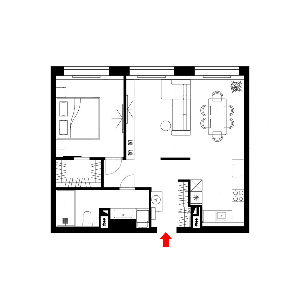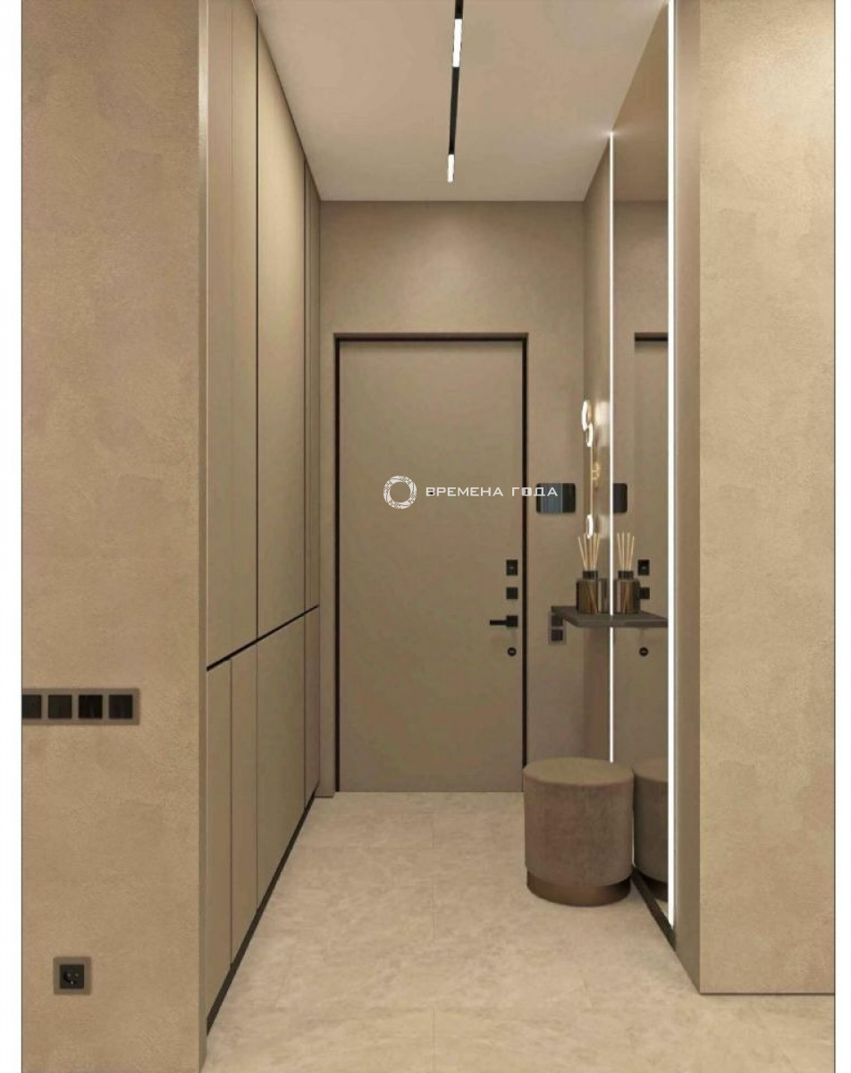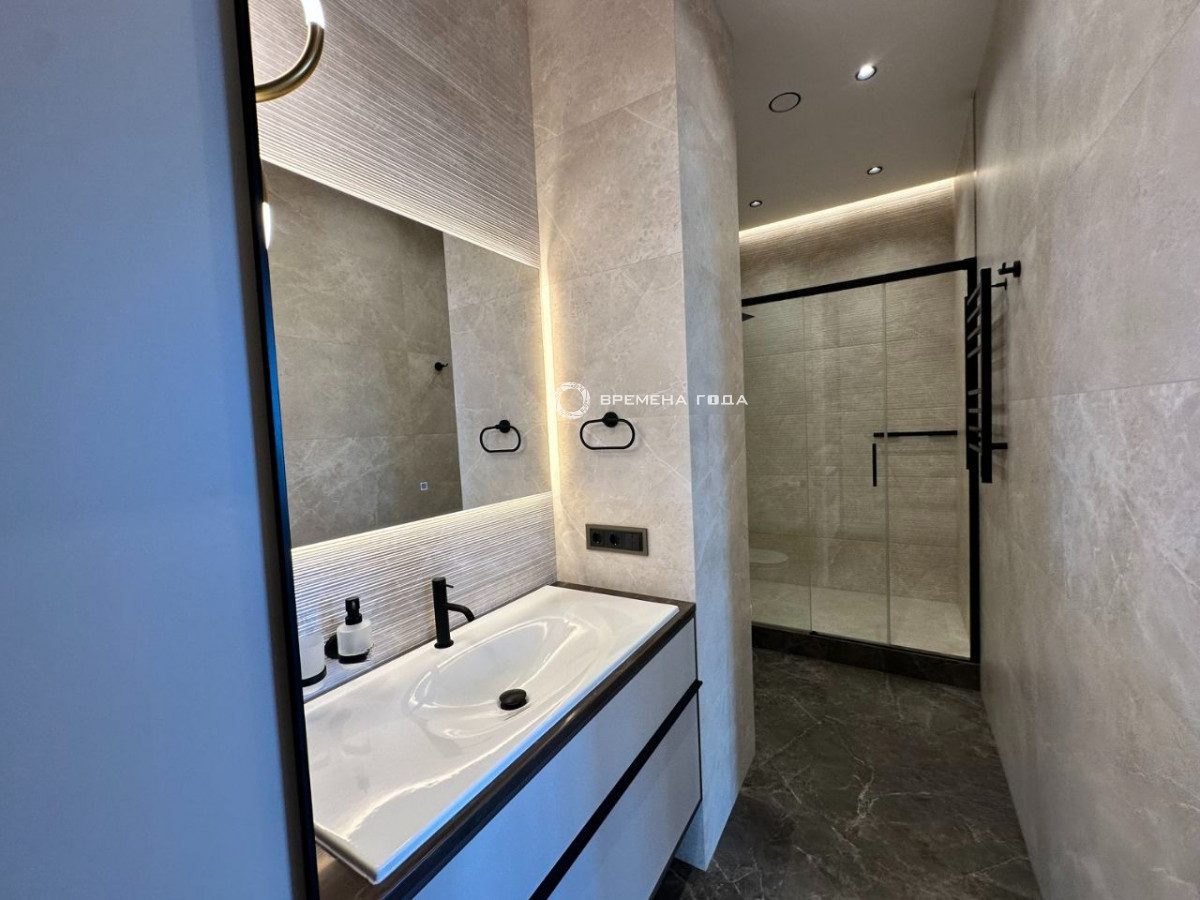 Планировочное решение: Просторная кухня-гостиная с панорамным видом, спальня расчитана, чтобы установить большую кровать, а функциональная гардеробная позволит удобно разместить все вещи. Совмещенный санузел с большой душевой кабиной. Есть постирочная зона с техникой Asko.