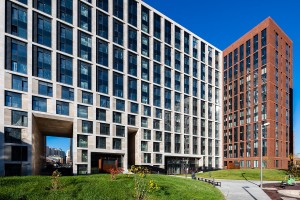 Вид во внутренний благоустроенный двор ЖК, в сторону Москва-Сити.