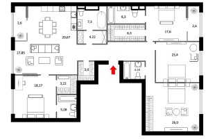 Возможный вариант планировки: кухня столовая с обеденной зоной и гостиной, две изолированные спальни, три санузла, постирочная и гардеробная комнаты, кладовая и выход на террасу.