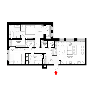 Возможный вариант планировки: кухня с обеденной зоной и гостиной с выходом на балкон, изолированная спальня со своим санузлом, изолированная спальня со своей гардеробной комнатой, два санузла, постирочная, гардеробная при входе.