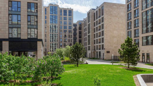 В отделке фасадов жилого комплекса использован юрский мрамор светлого оттенка.