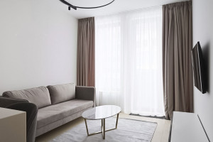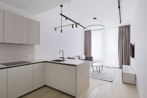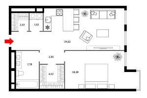 Планировочное решение: кухня-гостиная, спальня, 2 санузла (в гостевом санузле установлена душевая кабина), гардеробная, холл, лоджия