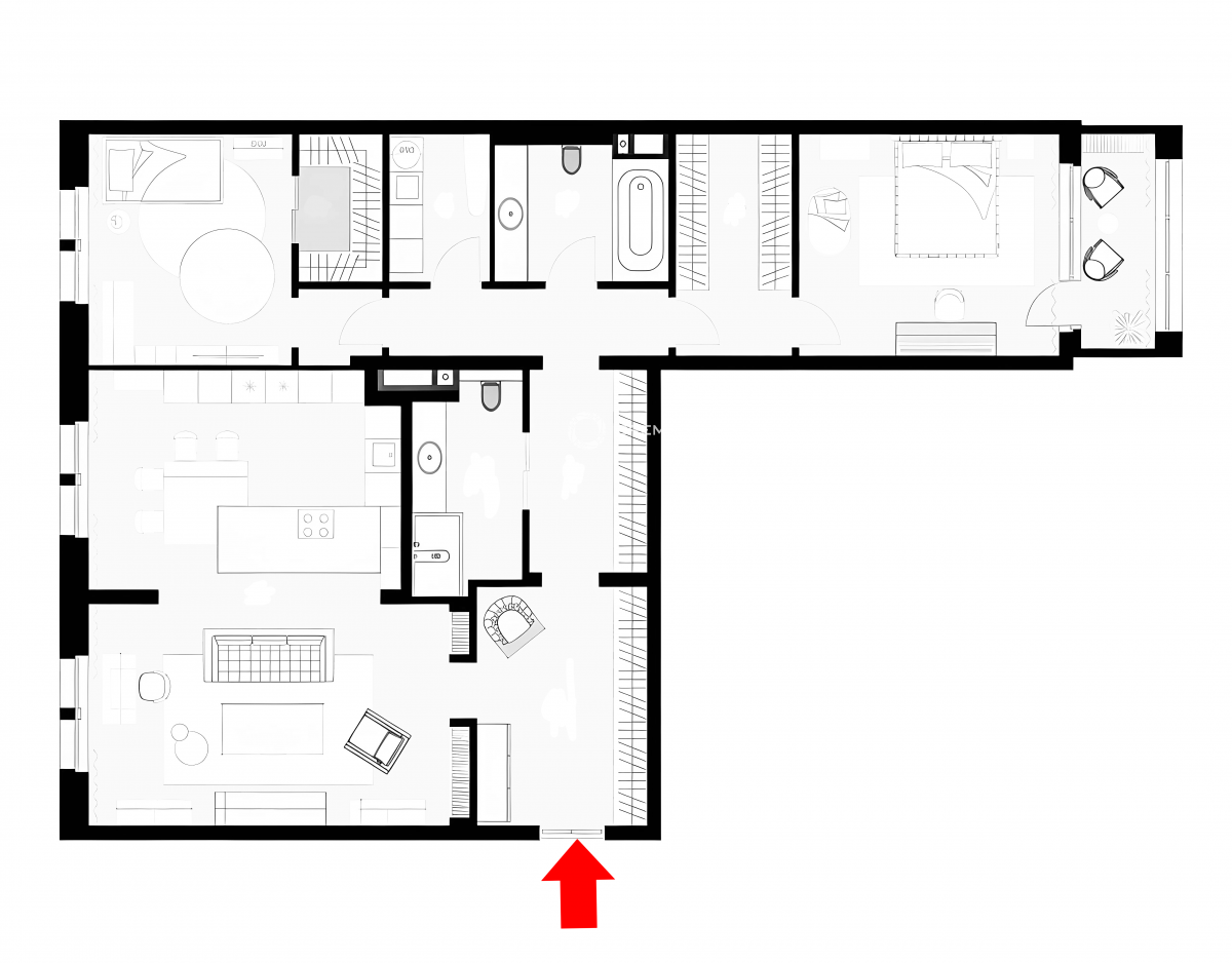 Планировочное решение: кухня с обеденной зоной и гостиной, спальня с выходом на лоджию, детская спальня, два санузла, две гардеробные комнаты, отдельная постирочная, холл.