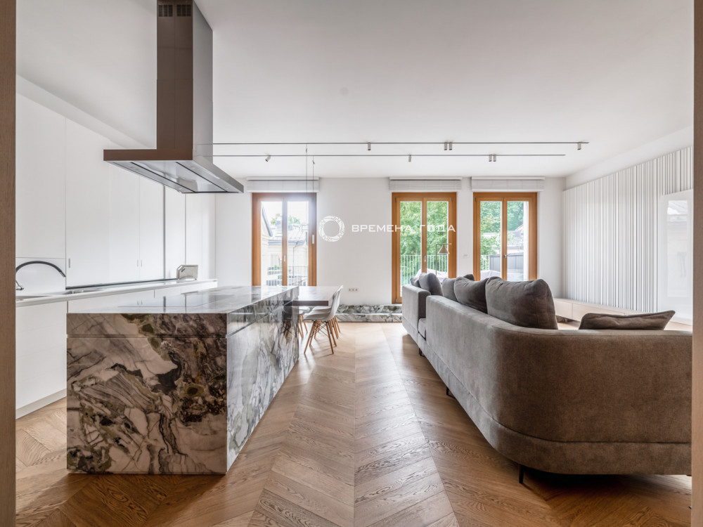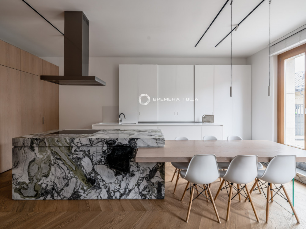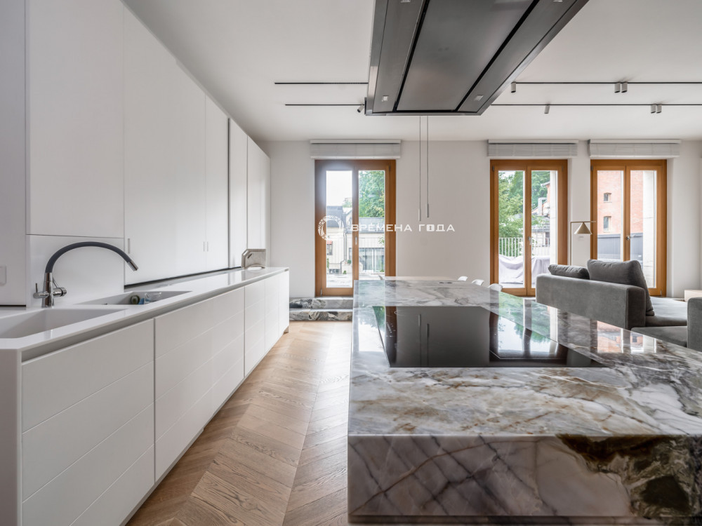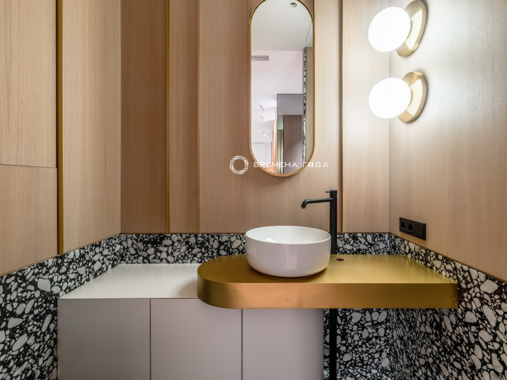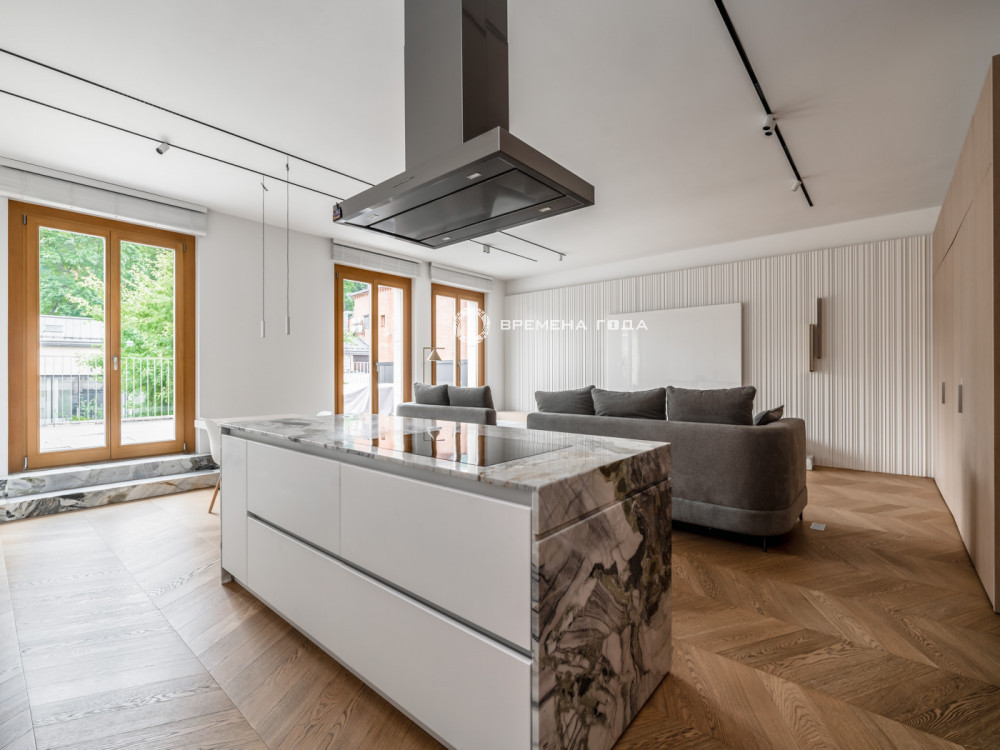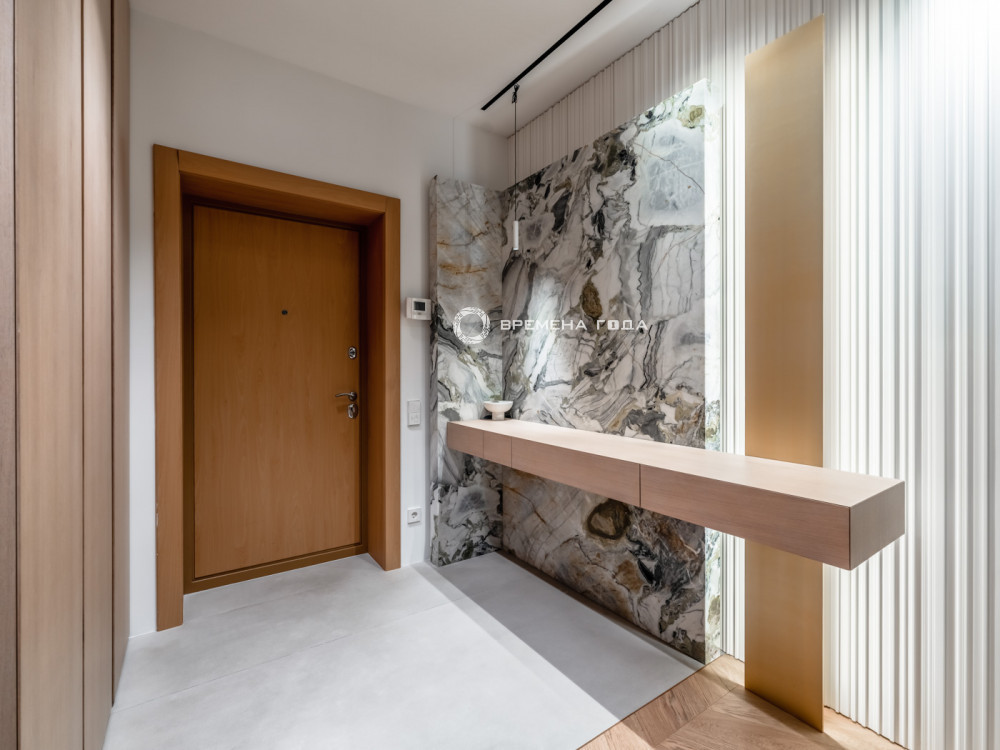 Выполнен дизайнерский ремонт с использованием высококачественных материалов: мрамор, дерево натуральный дуб, латунь, на полу инженерная доска (дуб),