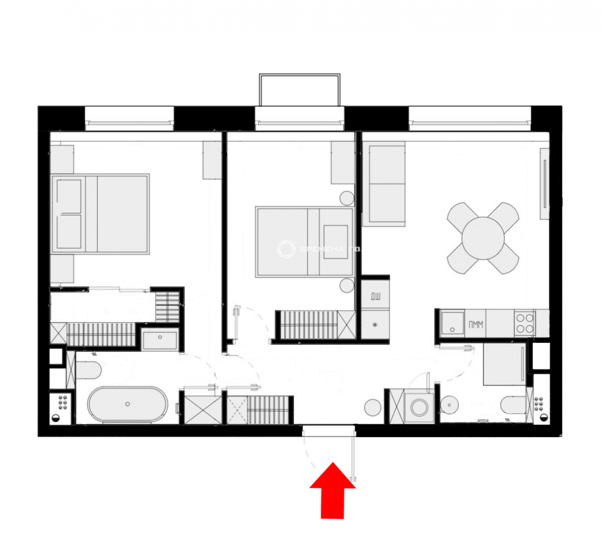 Планировочное решение: кухня с обеденной зоной и гостиной, мастер-спальня со своим санузлом и гардеробной комнатой, изолированная спальня, гостевой санузел, постирочная, холл