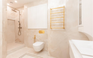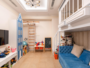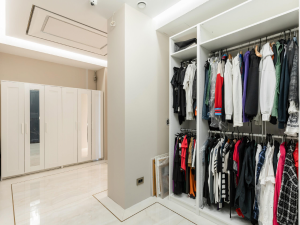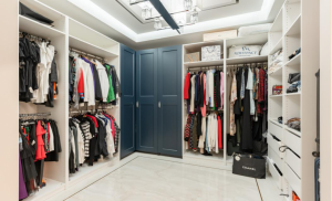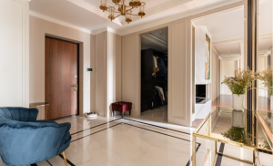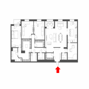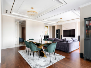 Планировочное решение: кухня с обеденной зоной и гостиной, три мастер-спальни со своими санузлами и гардеробными комнатами, кабинет, гостевой санузел, три кладовые, холл.
