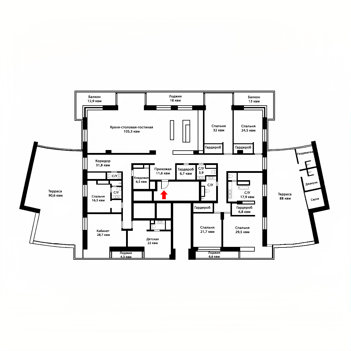 Планировка свободная, площадь и количество окон позволяют спланировать 6 спален с собственными ванными и гардеробными, просторную гостиную, необходимое количество подсобных помещений.