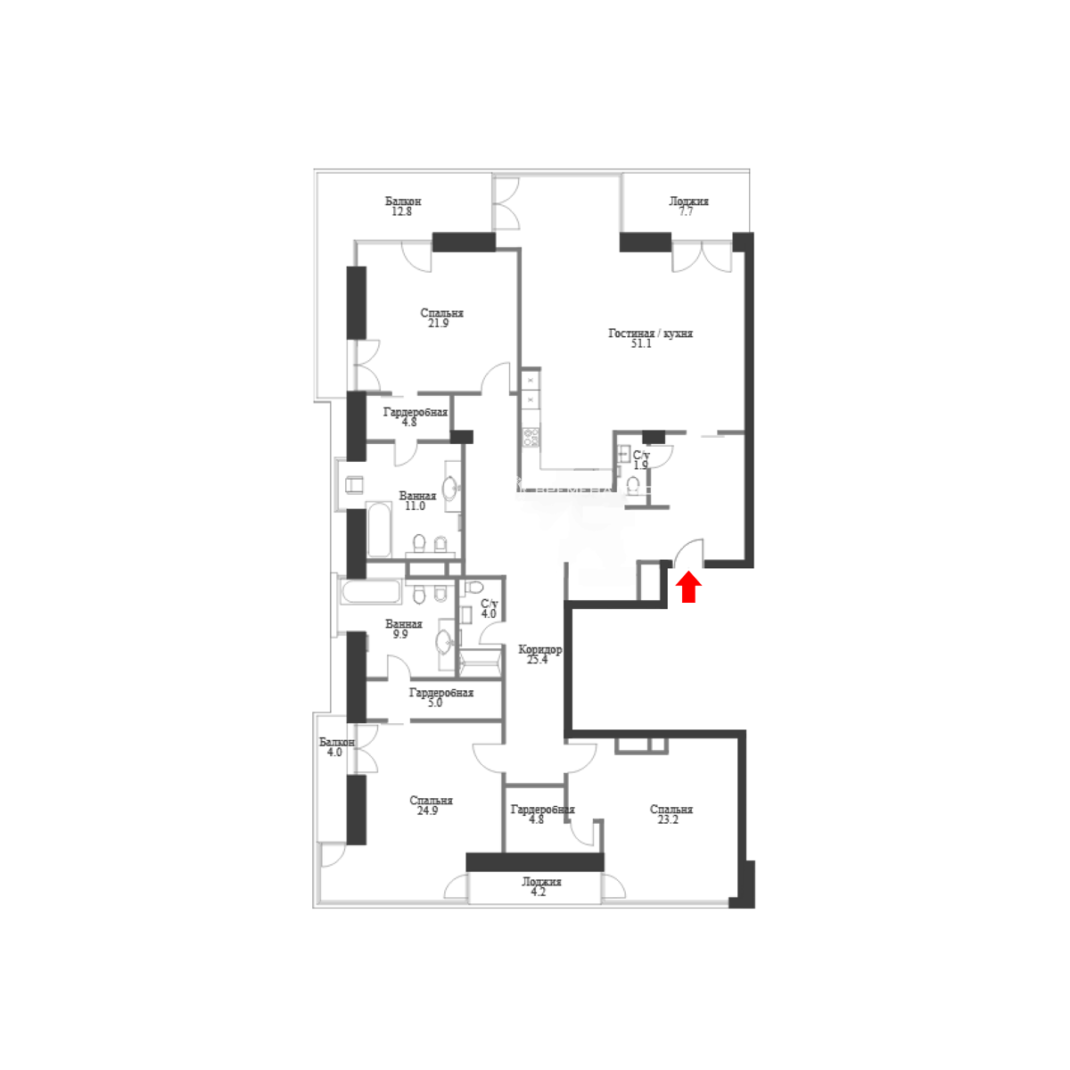 Свободная планировка: гостиная, кухня-столовая, три мастер-спальни со своими санузлами и гардеробными комнатами, гостевой санузел, , холл..