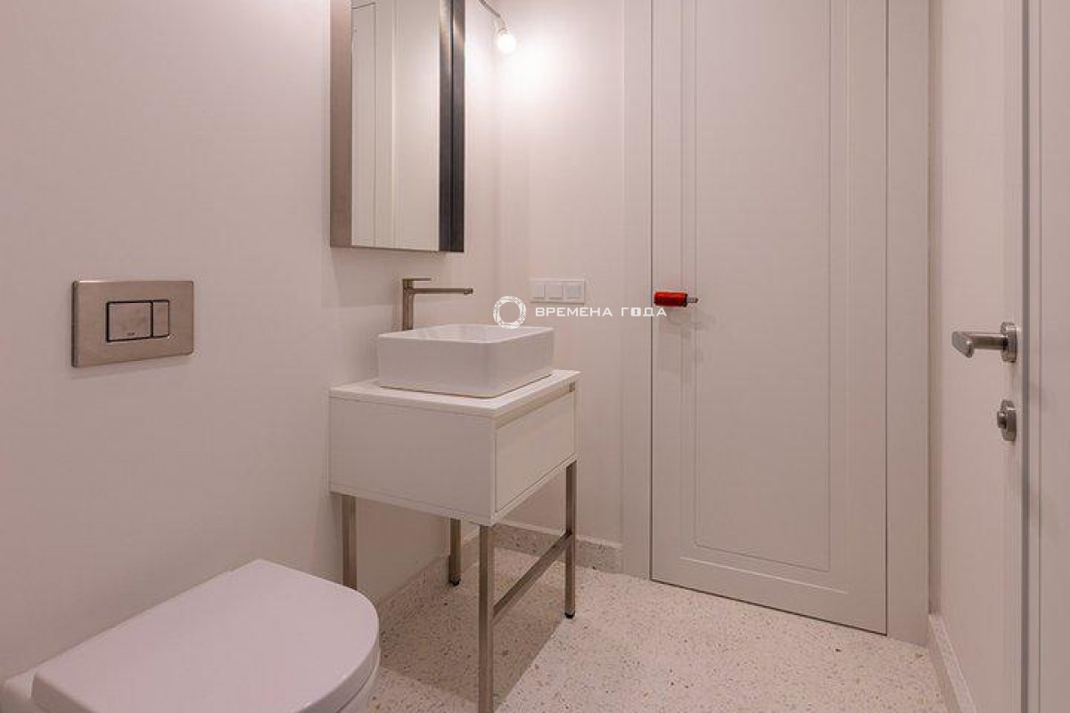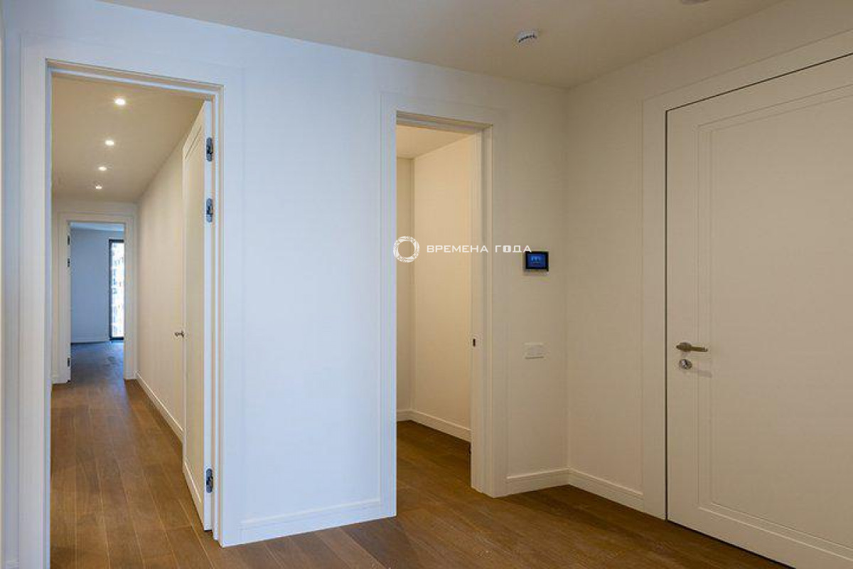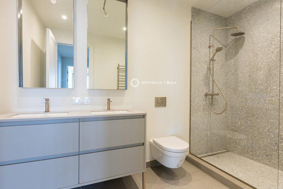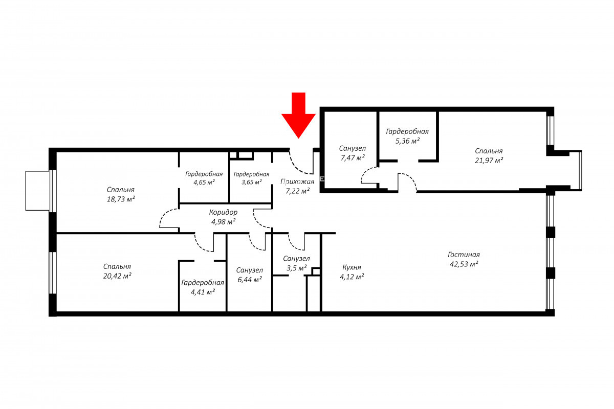 Планировочное решение: просторная кухня с обеденной зоной и гостиной, мастер-спальня со своим санузлом и гардеробной комнатой, две спальни, два санузла, гардеробная комната, холл