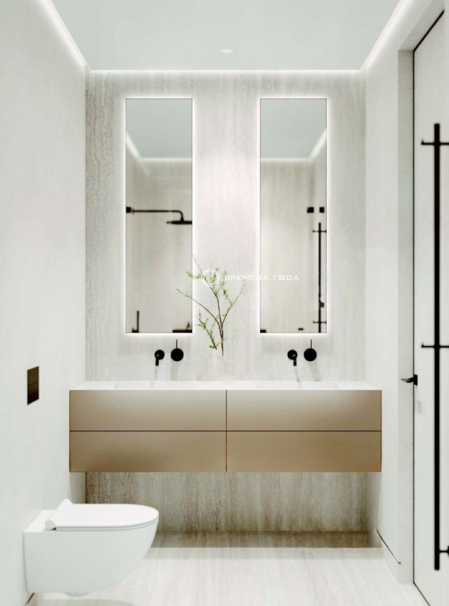 Планировочное решение: кухня с обеденной зоной и гостиной, две мастер спальни со своим санузлами и гардеробными, комната свободного назначения, гостевой санузел, постирочная, гардеробная, прихожая.