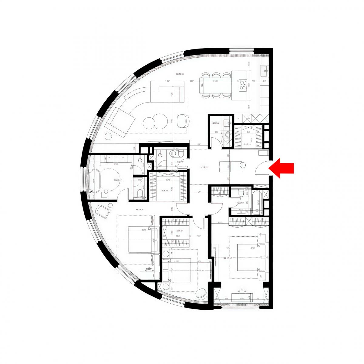 Возможный вариант планировки: кухня с обеденной зоной и гостиной, мастер-спальня со своим санузлом и гардеробной комнатой, спальня с санузлом и гардеробом, спальня с гардеробной, гостевой санузел, постирочная, гардеробная комната при входе