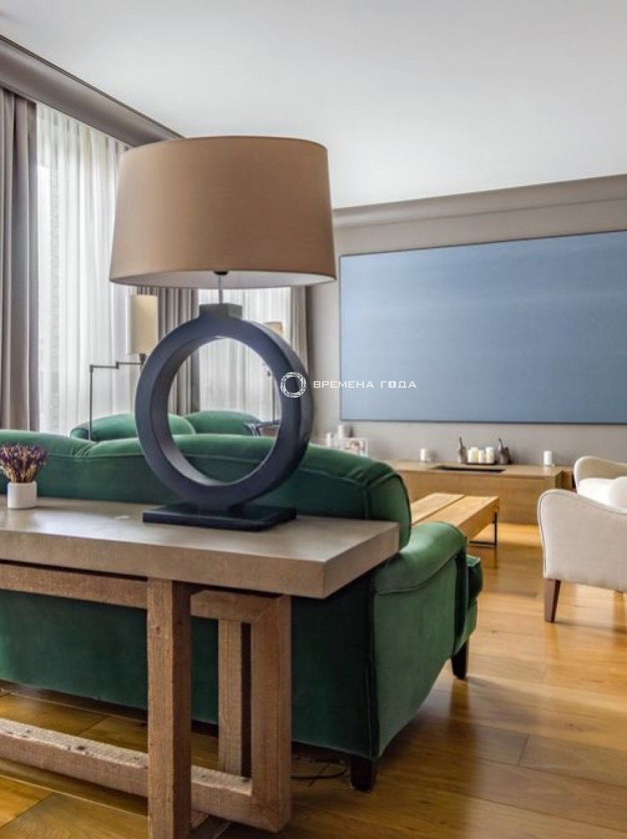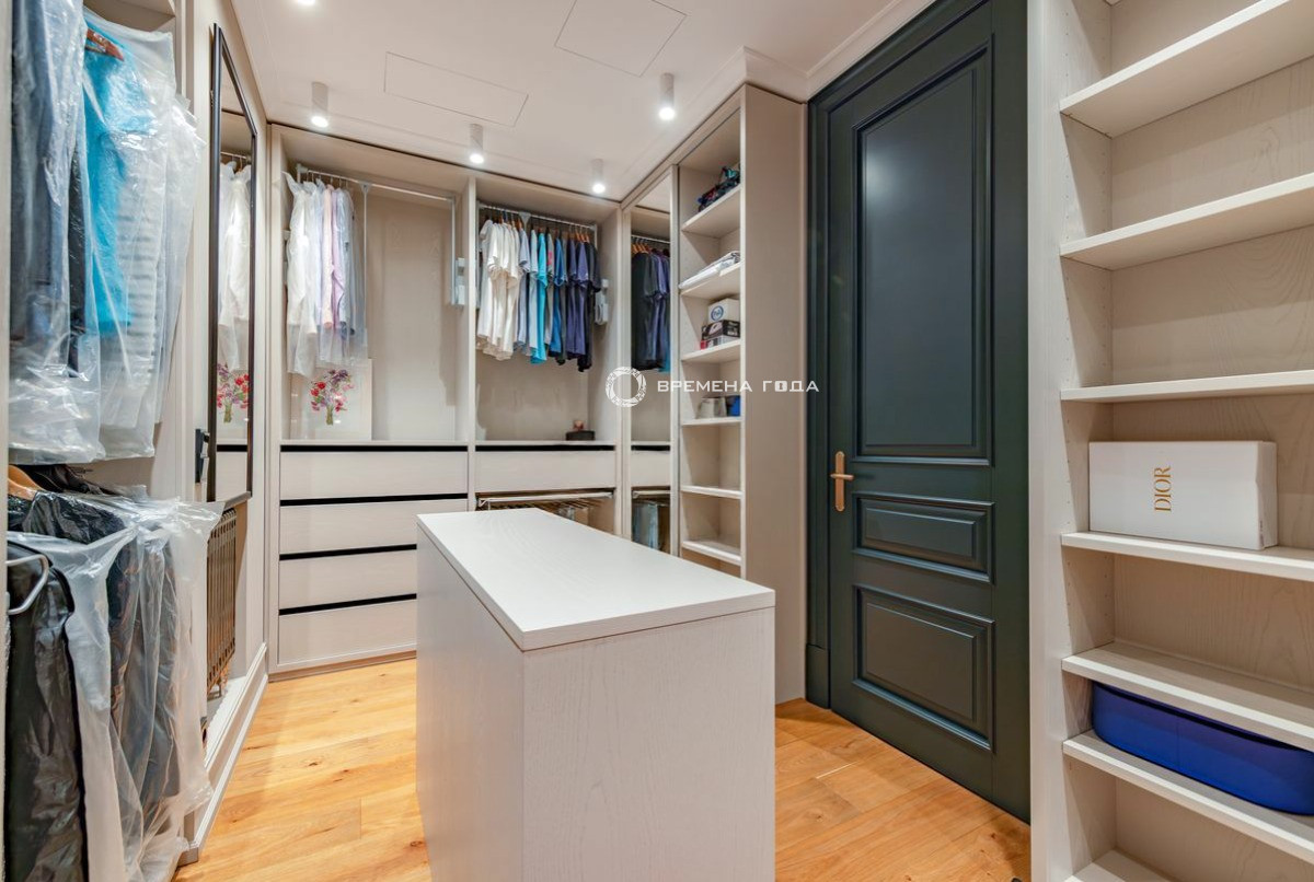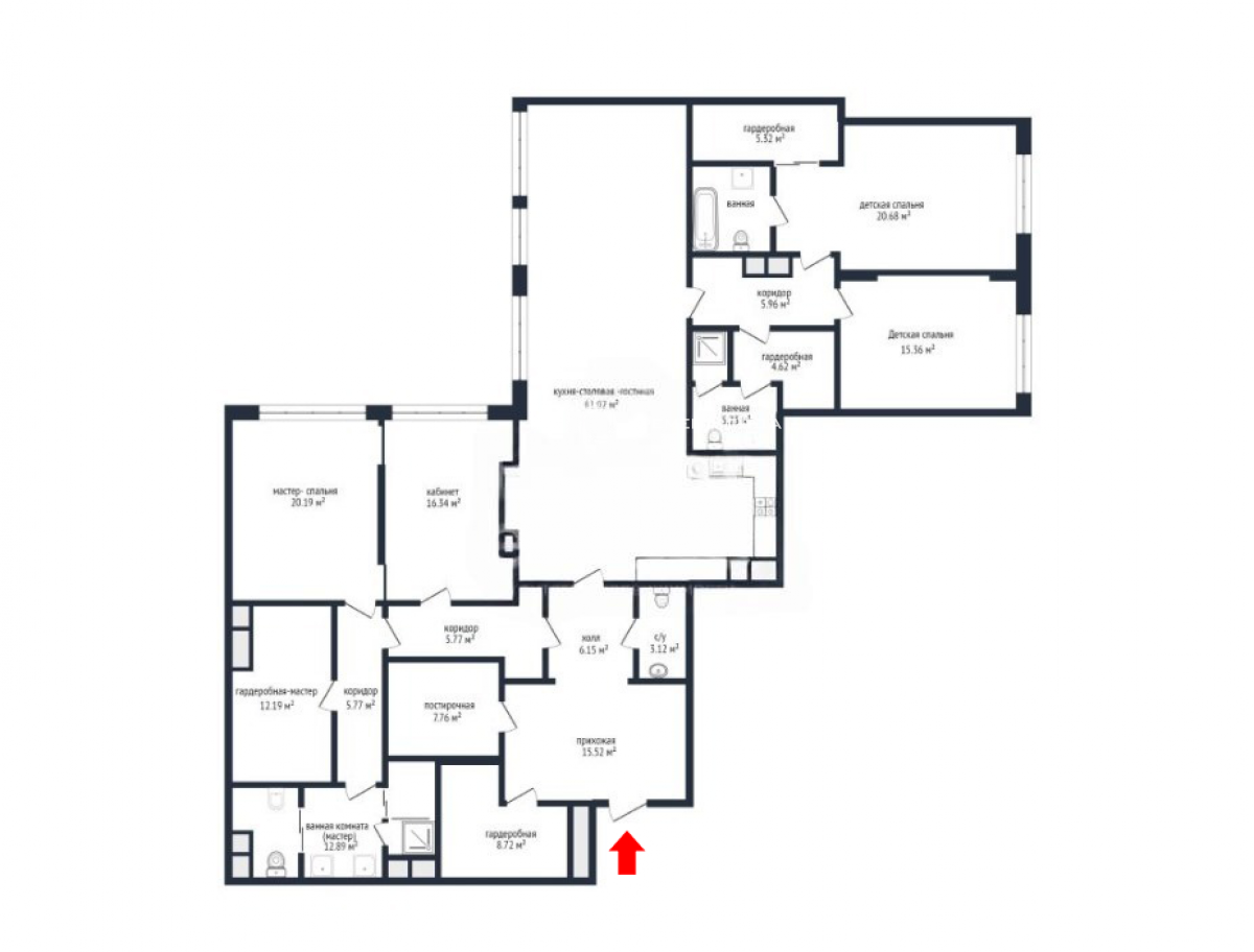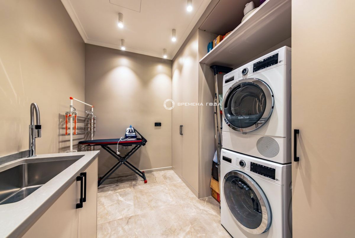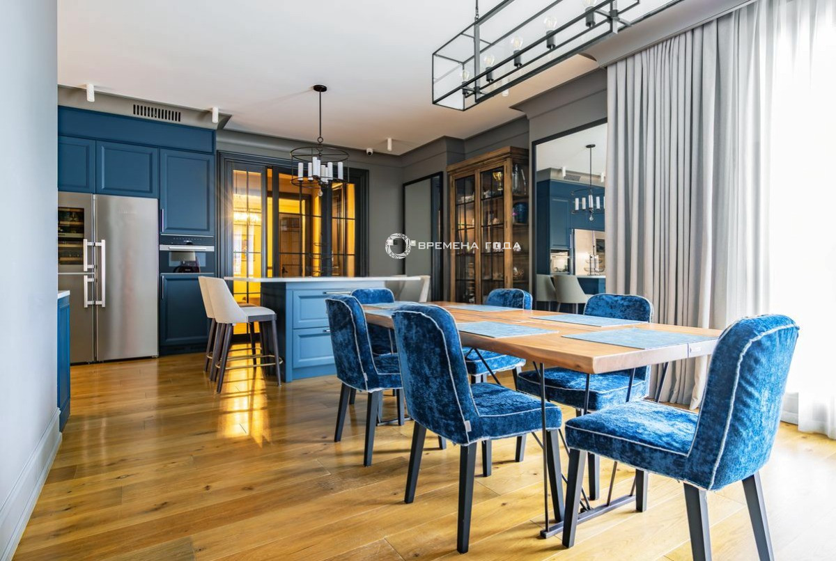 Планировочное решение: кухня с обеденной зоной и гостиной, три спальни, четыре санузла, гардеробная комната, холл.