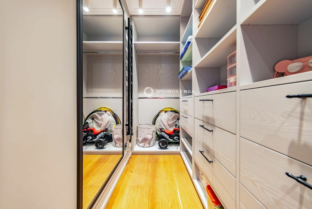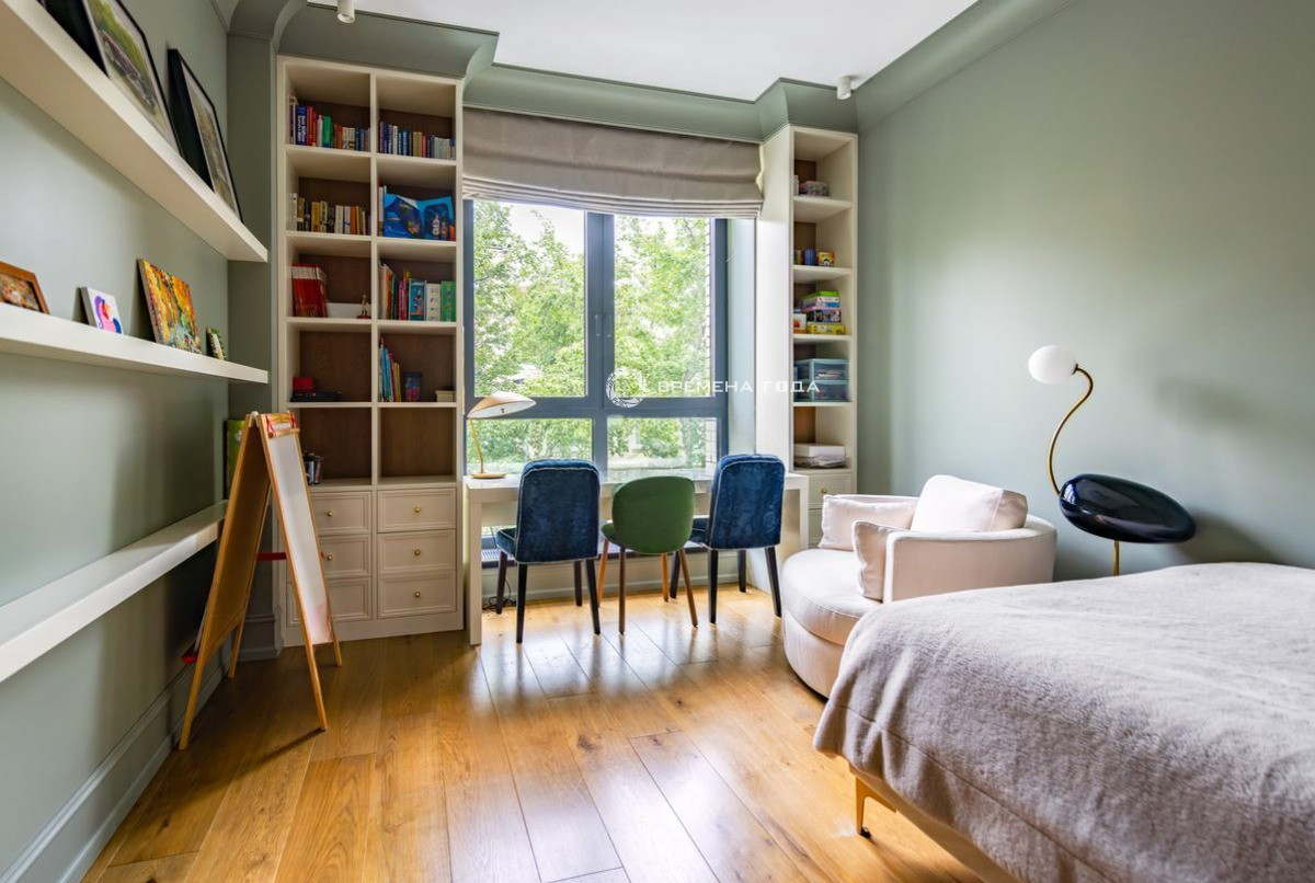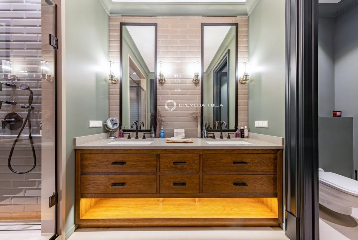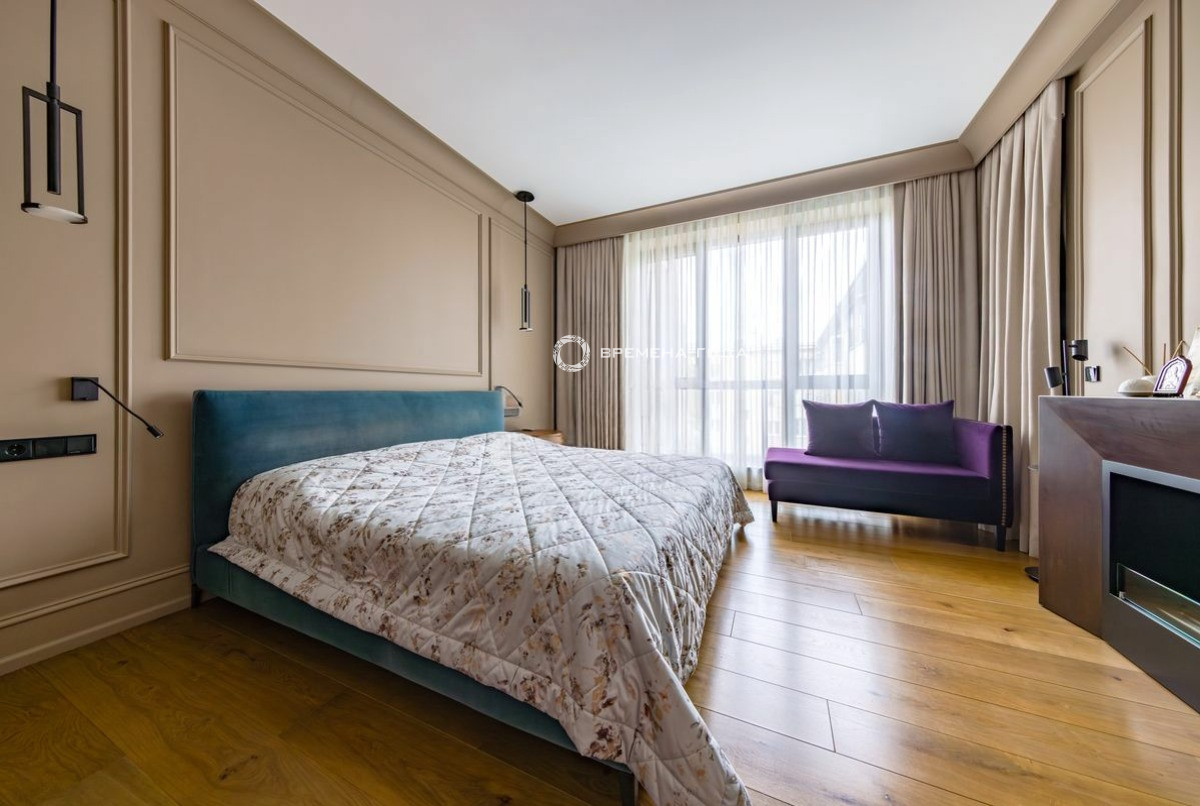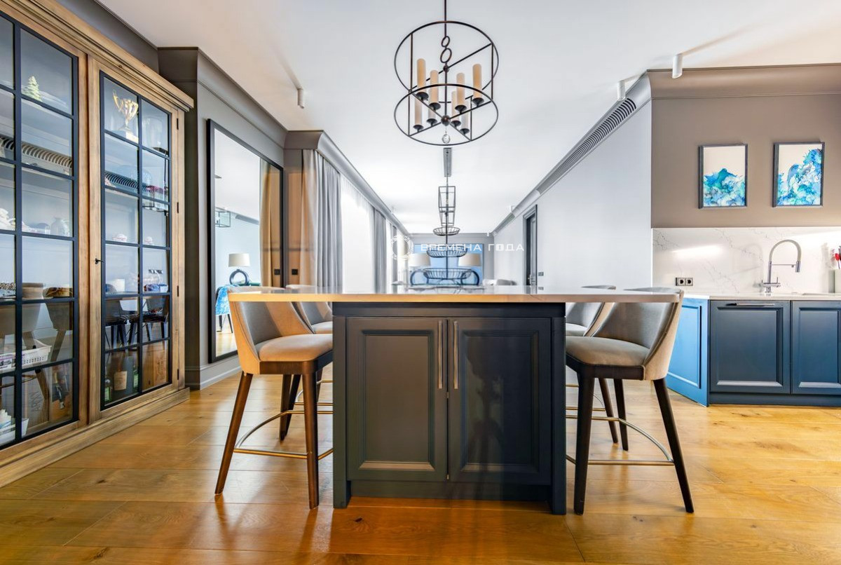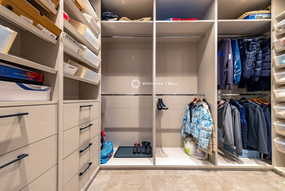 Планировочное решение: кухня с обеденной зоной и гостиной, три спальни, четыре санузла, гардеробная комната, холл.