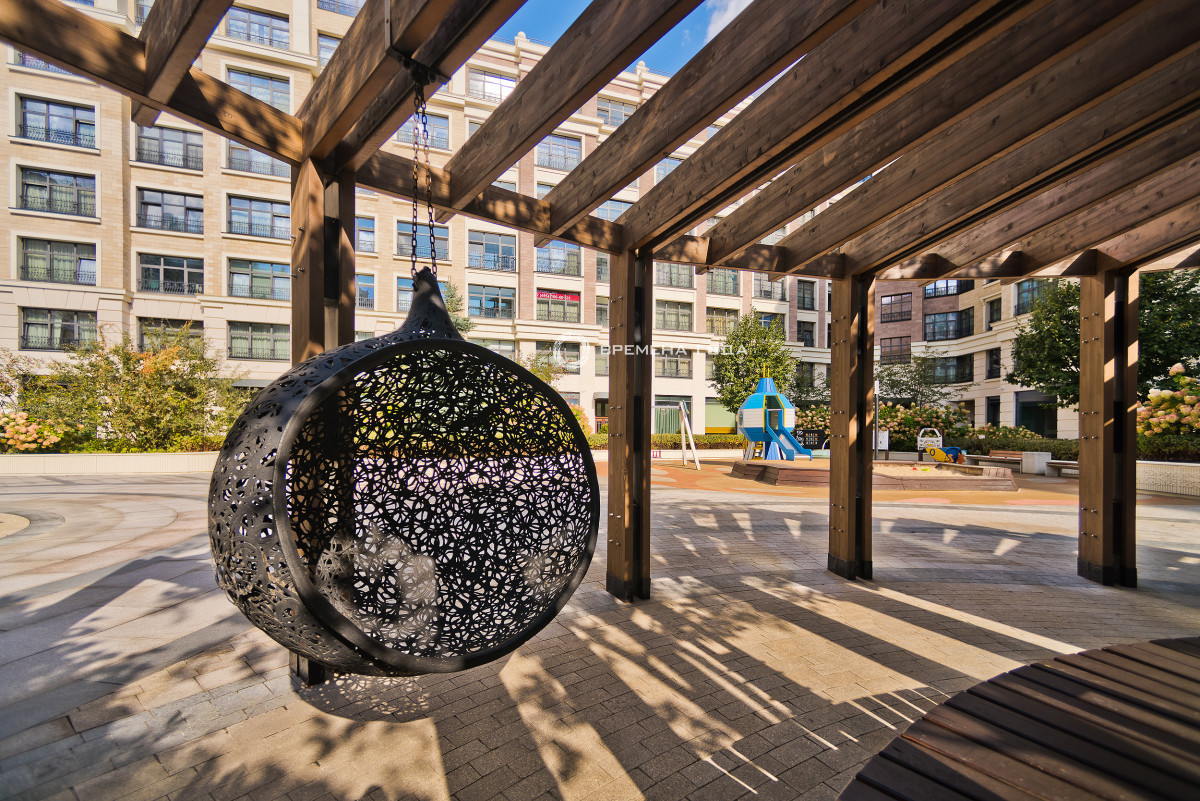 На закрытой для доступа посторонних придомовой территории организовано максимально комфортное пространство для детей и взрослых. Здесь устроены игровые и спортивные площадки, масштабная прогулочная зоны, высажены зеленые насаждения, проложены велодорожки.