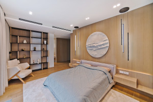 Возможный вариант планировки: кухня с обеденной зоной и гостиной, мастер-спальня со своим санузлом и гардеробной комнатой, изолированная спальня, гостевой санузел , гардеробная при входе.
