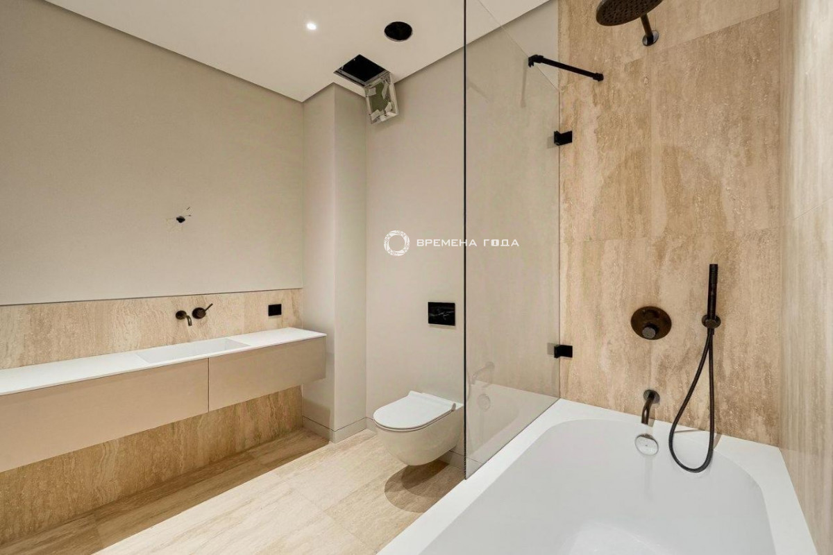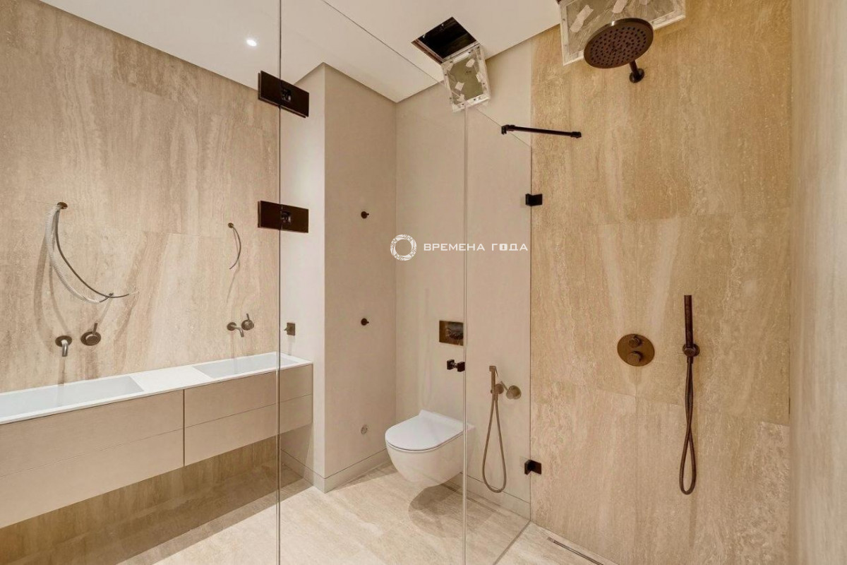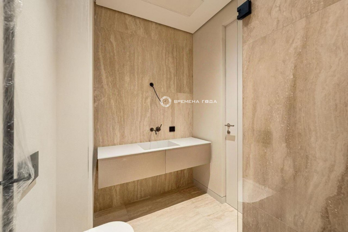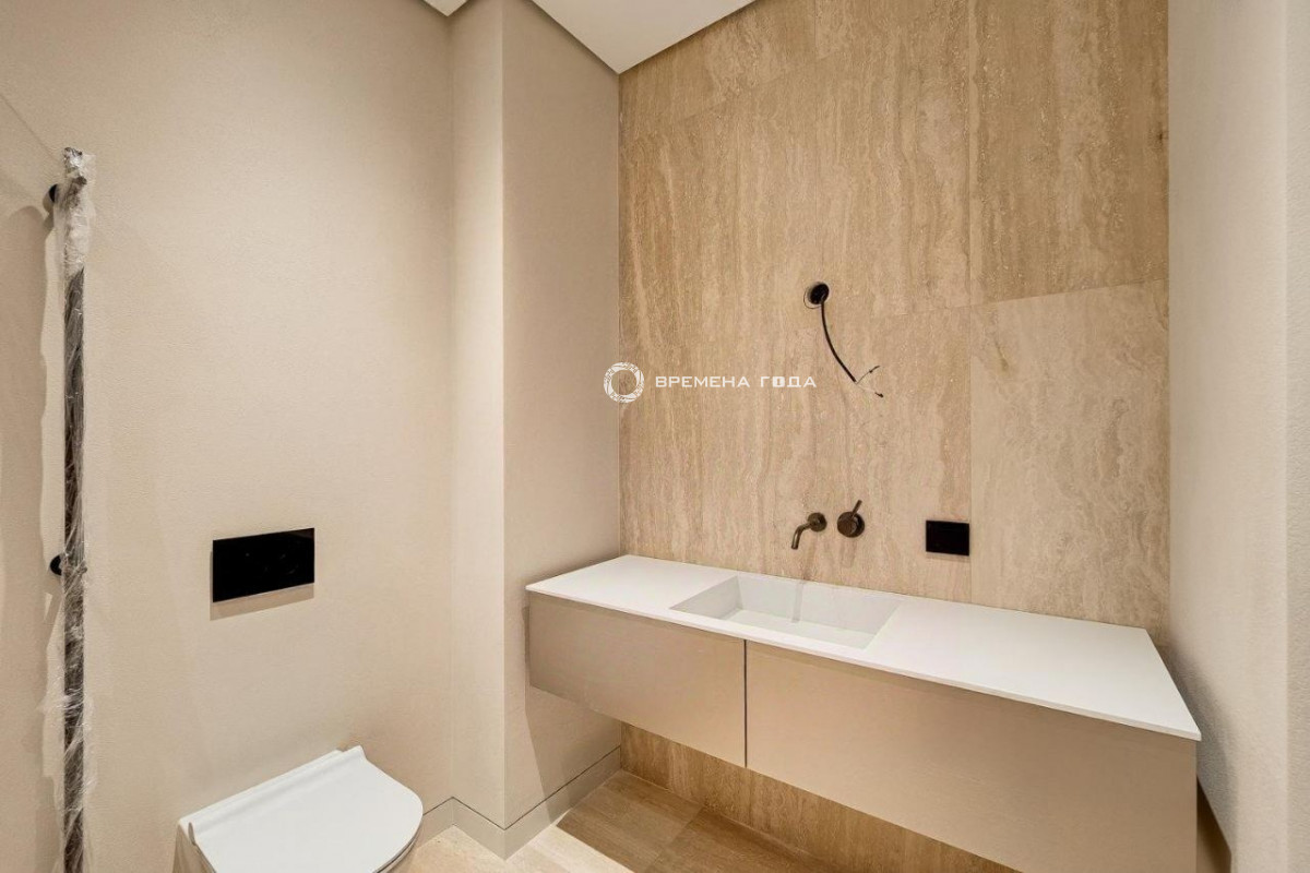 Планировочное решение: кухня с обеденной зоной и гостиной, три спальни, четыре санузла, постирочная и гардеробная комнаты, холл
