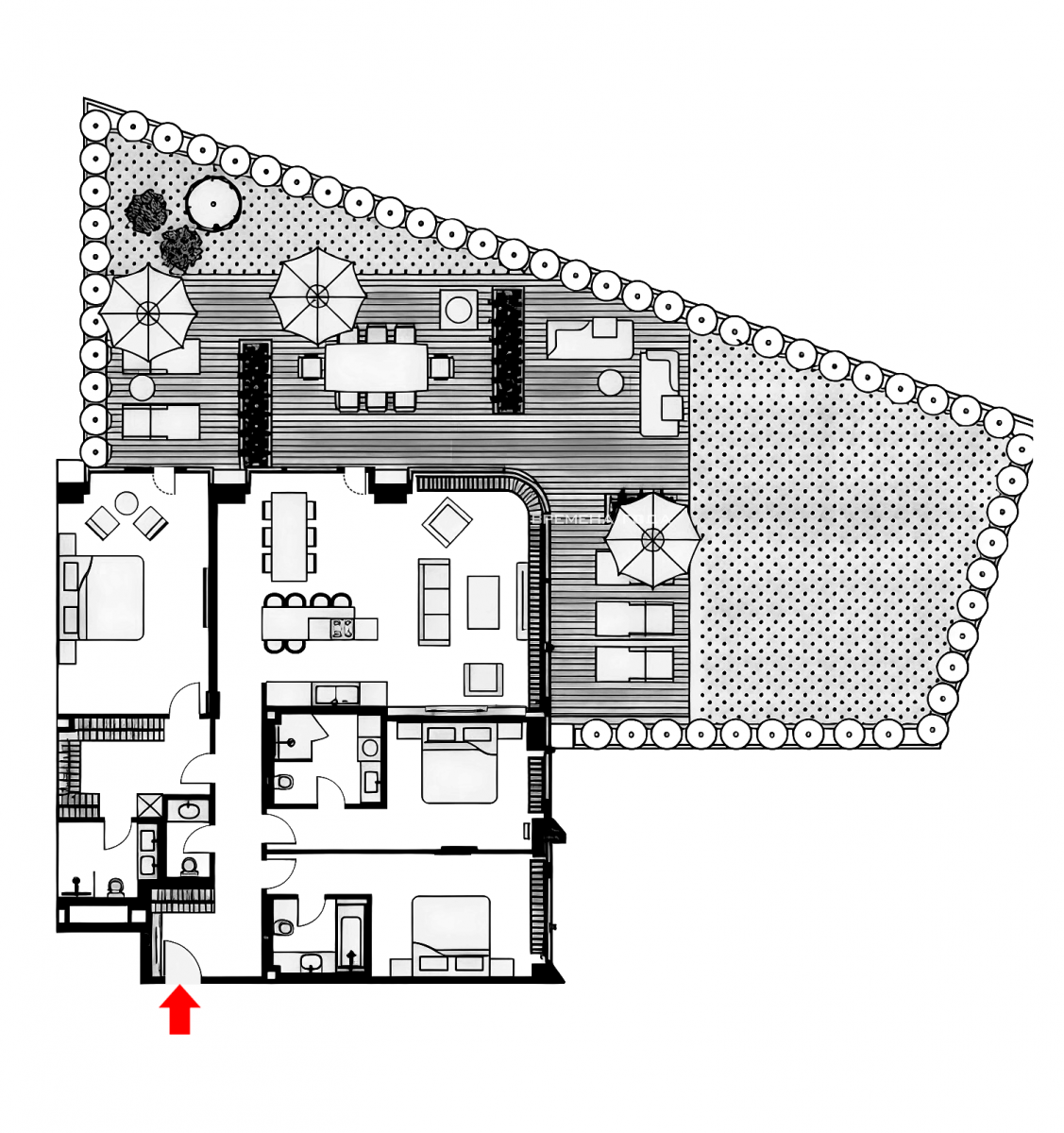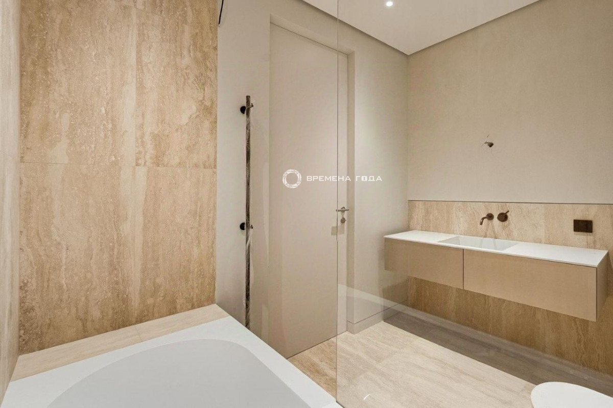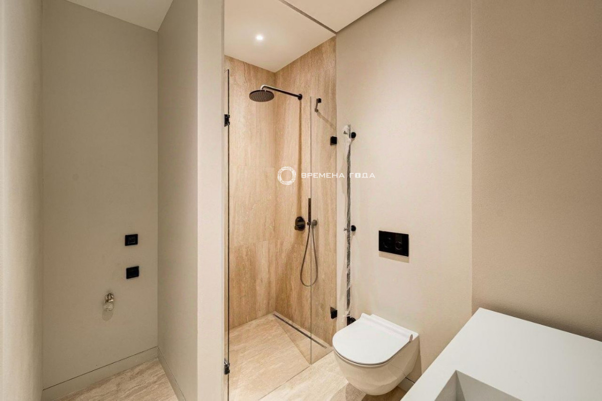 Планировочное решение: кухня с обеденной зоной и гостиной, три спальни, четыре санузла, постирочная и гардеробная комнаты, холл