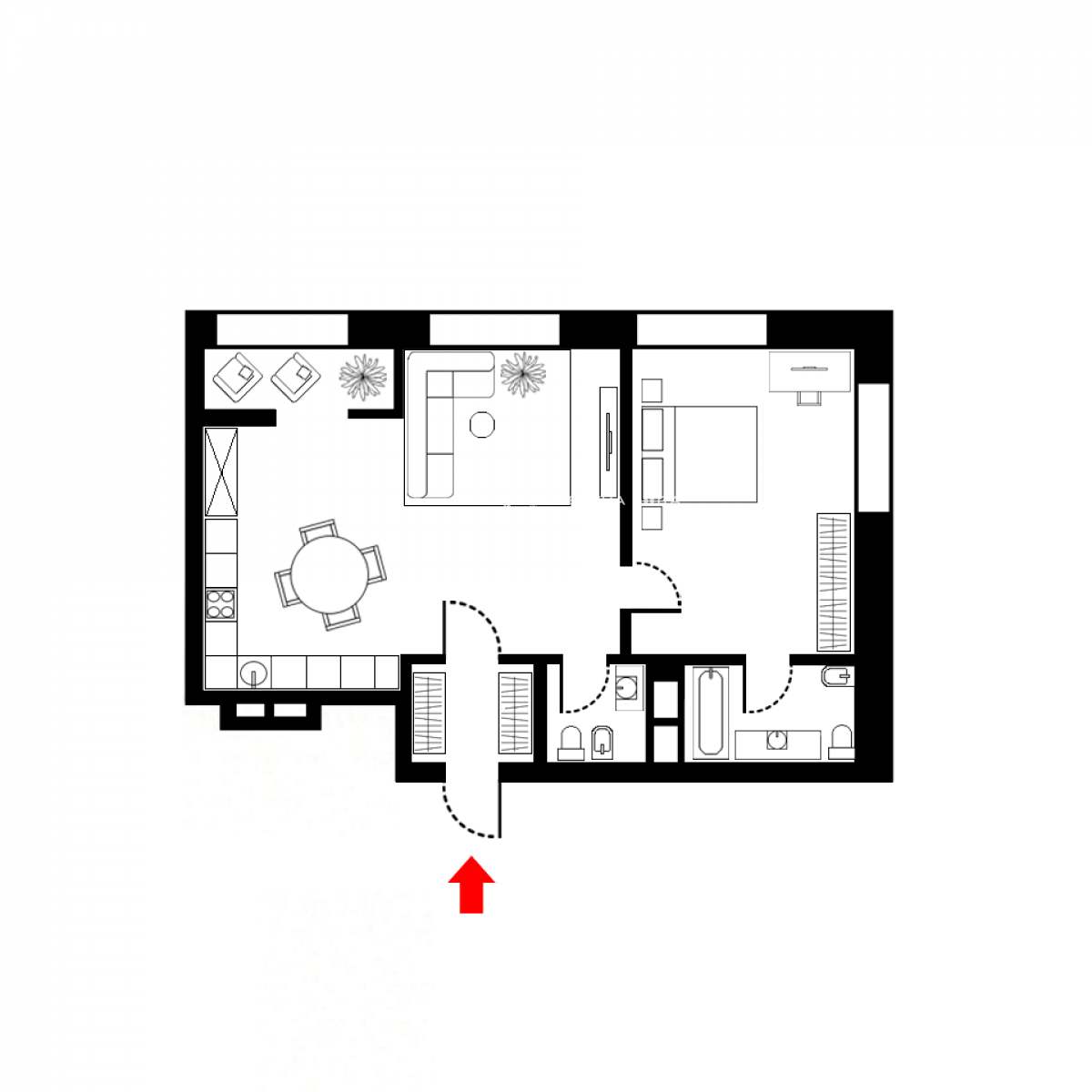Возможный вариант планировки: кухня с обеденной зоной и гостиной, две изолированные спальни, два санузла, гардеробная комната при входе
