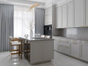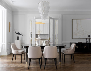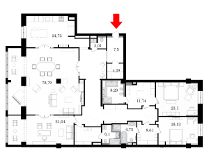 Возможный вариант планировки: кухня с обеденной зоной, гостиная, четыре изолированные спальни, комната для персонала, четыре санузла, гардеробные и постирочная комнаты, холл. Есть вывод под камин. Терраса