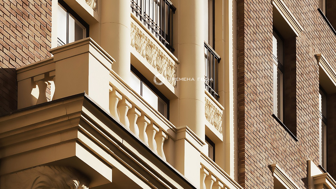Семиэтажный дом имеет 2 подъезда. Строгие классические формы, цокольная облицовка гранитом, скульптурное декорирование фасадов придают зданию черты респектабельности. На внутренней территории разбит симпатичный ландшафтный дворик в итальянском стиле — с фонтаном, перголами, с детской площадкой.