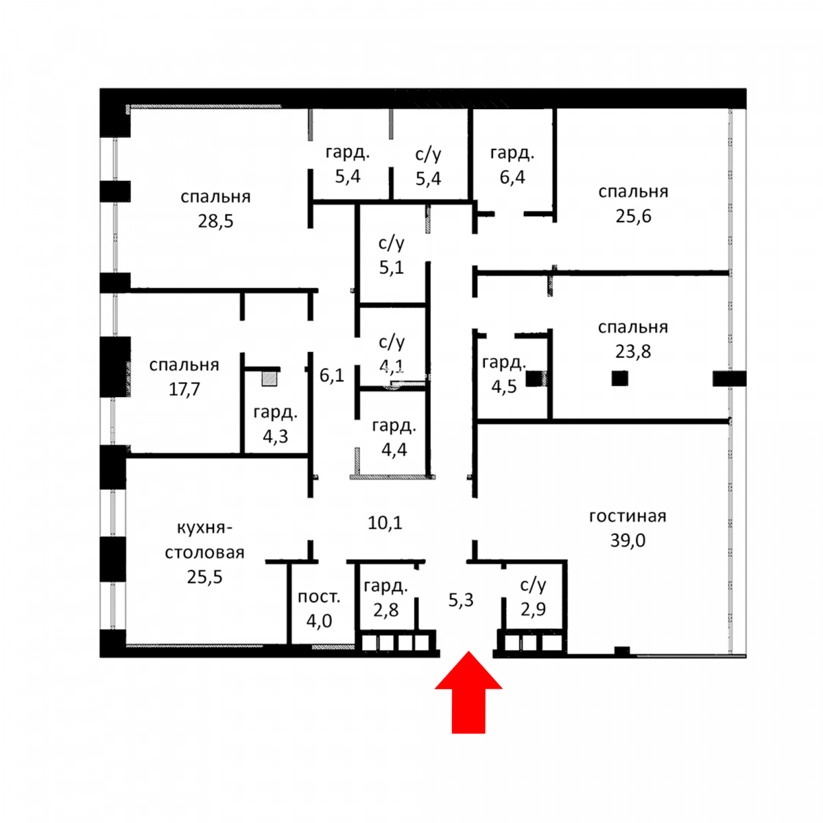 Возможный вариант планировки: кухня с обеденной зоной, гостиная, мастер-спальня с санузлом и гардеробной комнатой, три спальни с гардеробными комнатами, три санузла, постирочная, две гардеробные комнаты, холл