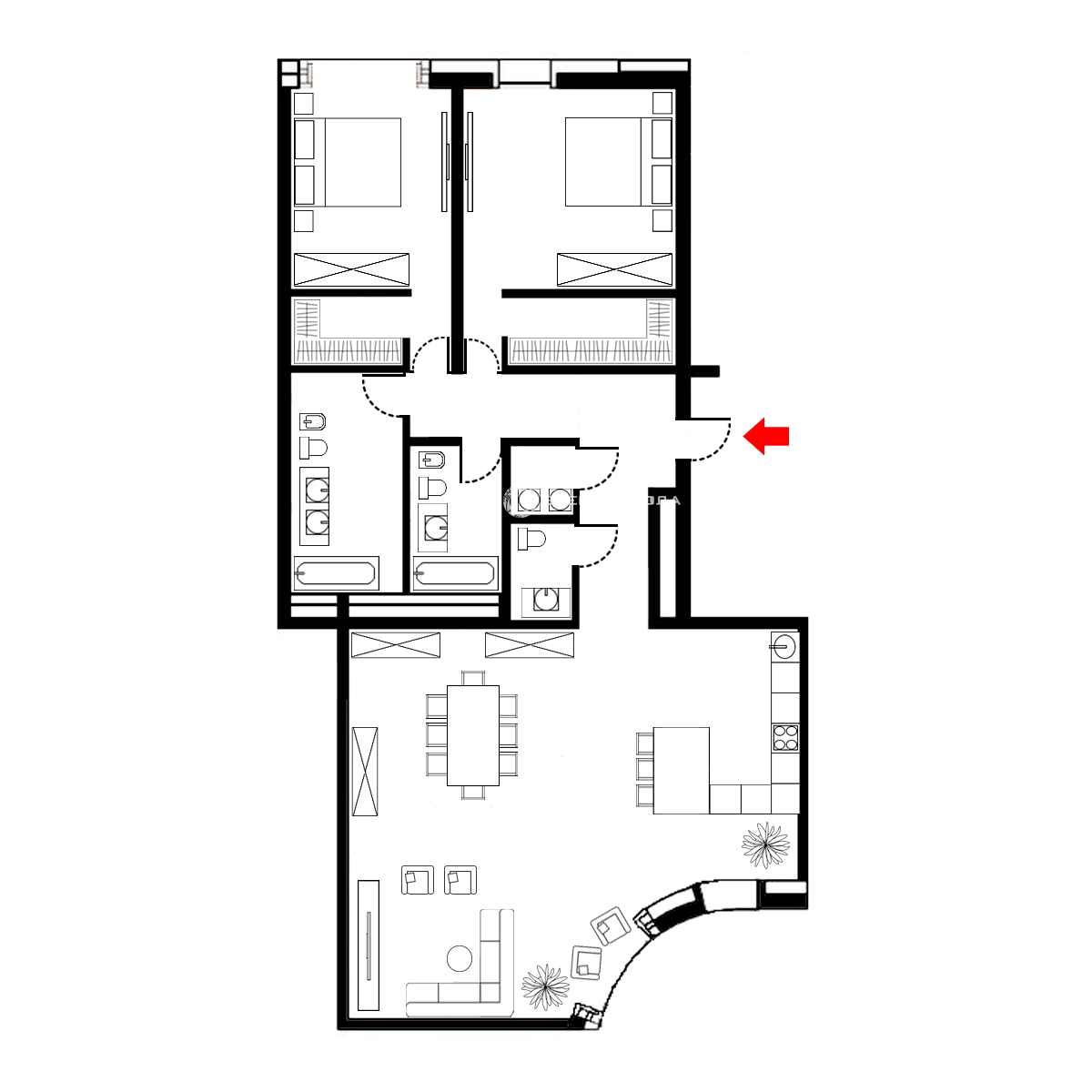 Возможный вариант планировки: кухня-гостиная с зоной столовой и панорамным остеклением, две спальни, каждая с со своим санузлом и гардеробной,
