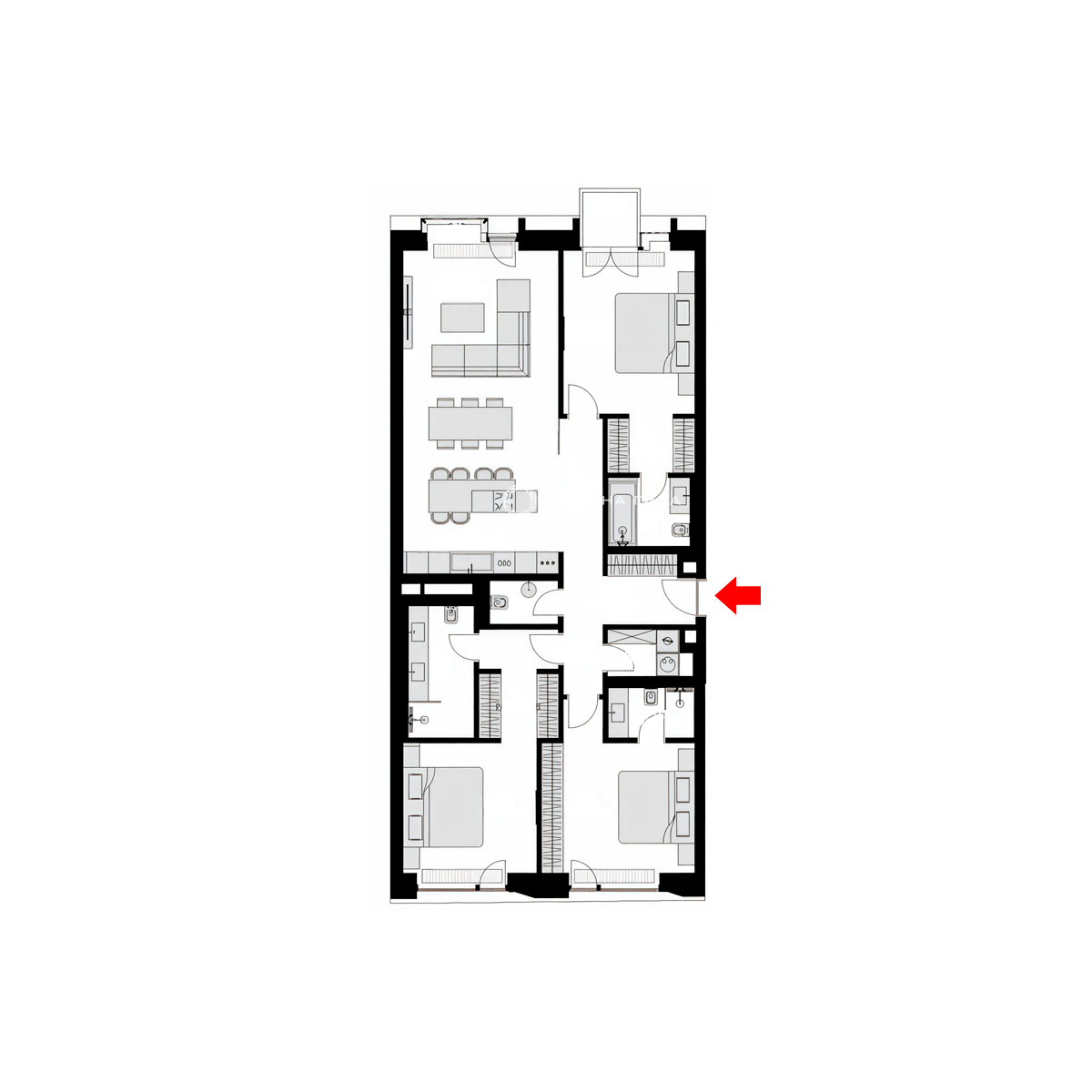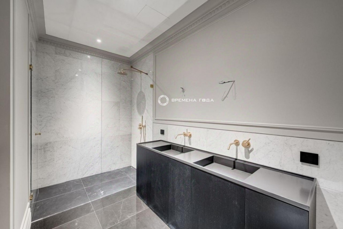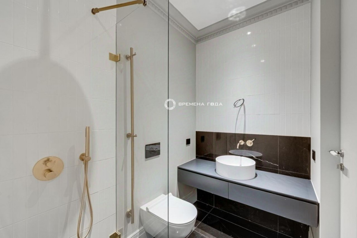 Планировочное решение: Просторная гостиная с балконом и кухней-нишей, две мастер-спальни со своей гардеробной и ванной комнатой, ещё одна уютная спальня со своим санузлом. При входе в квартиру - прихожая, гардероб и гостевой санузел