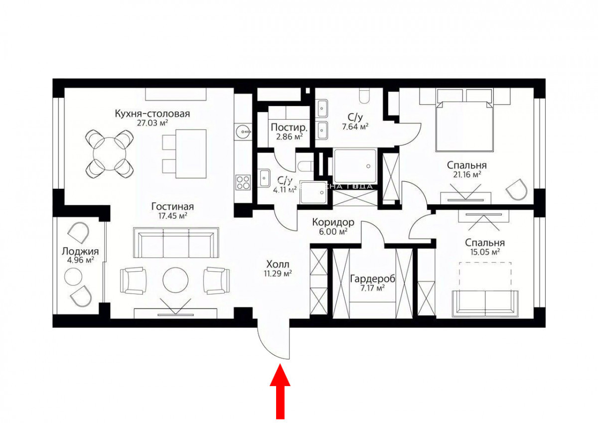 Планировочное решение: кухня с обеденной зоной, спальня со своим санузлом, спальня, гостевой санузел, постирочная, прихожая