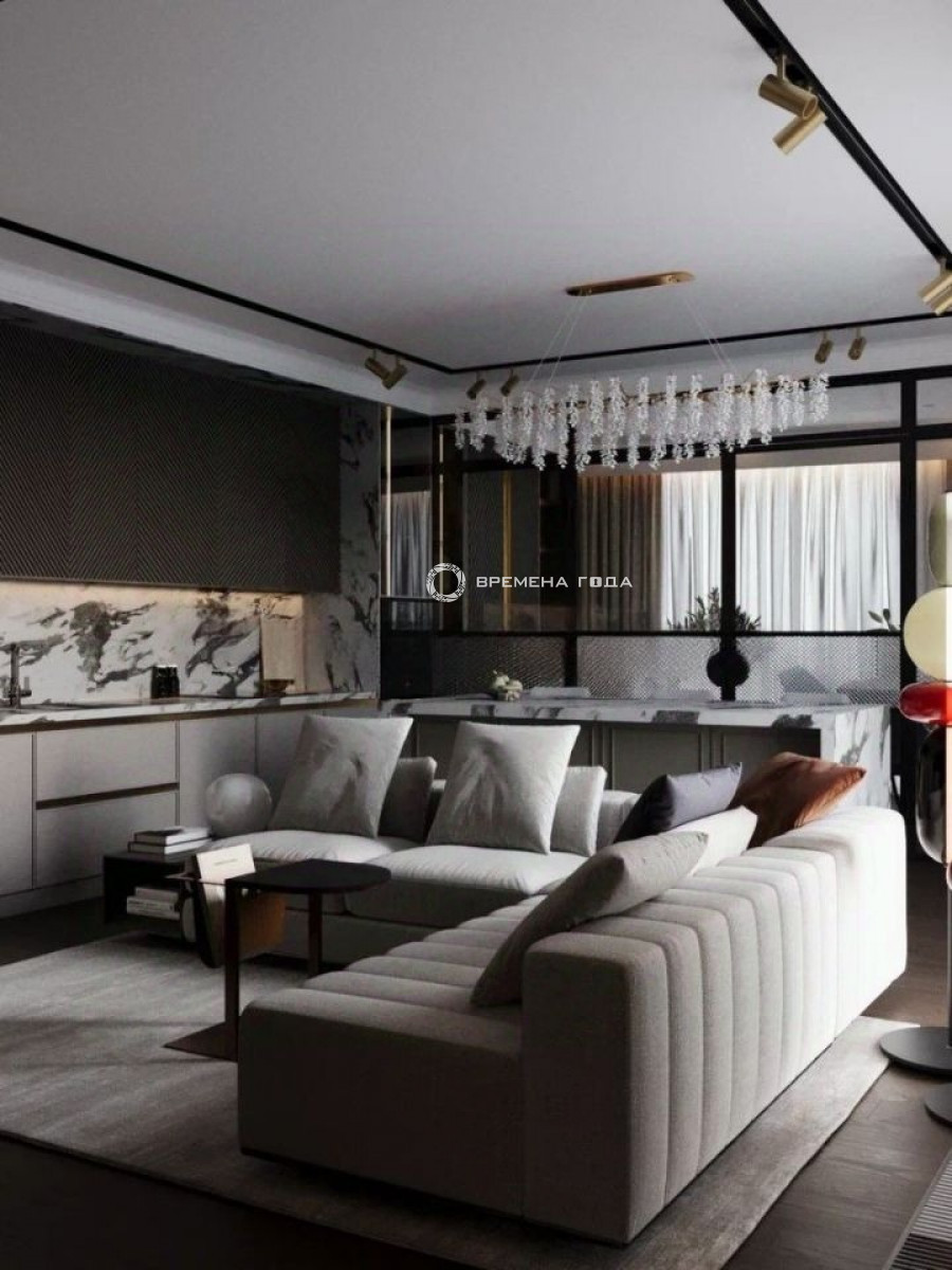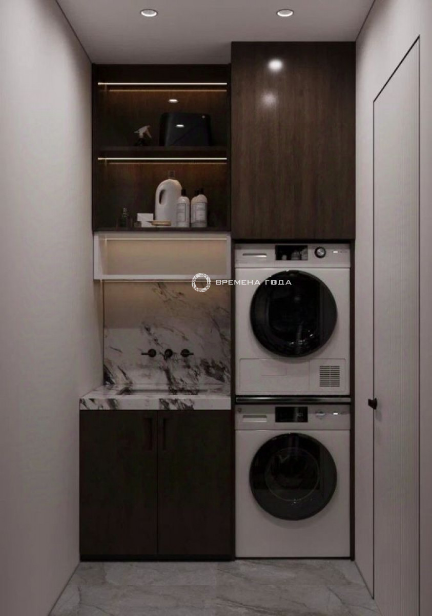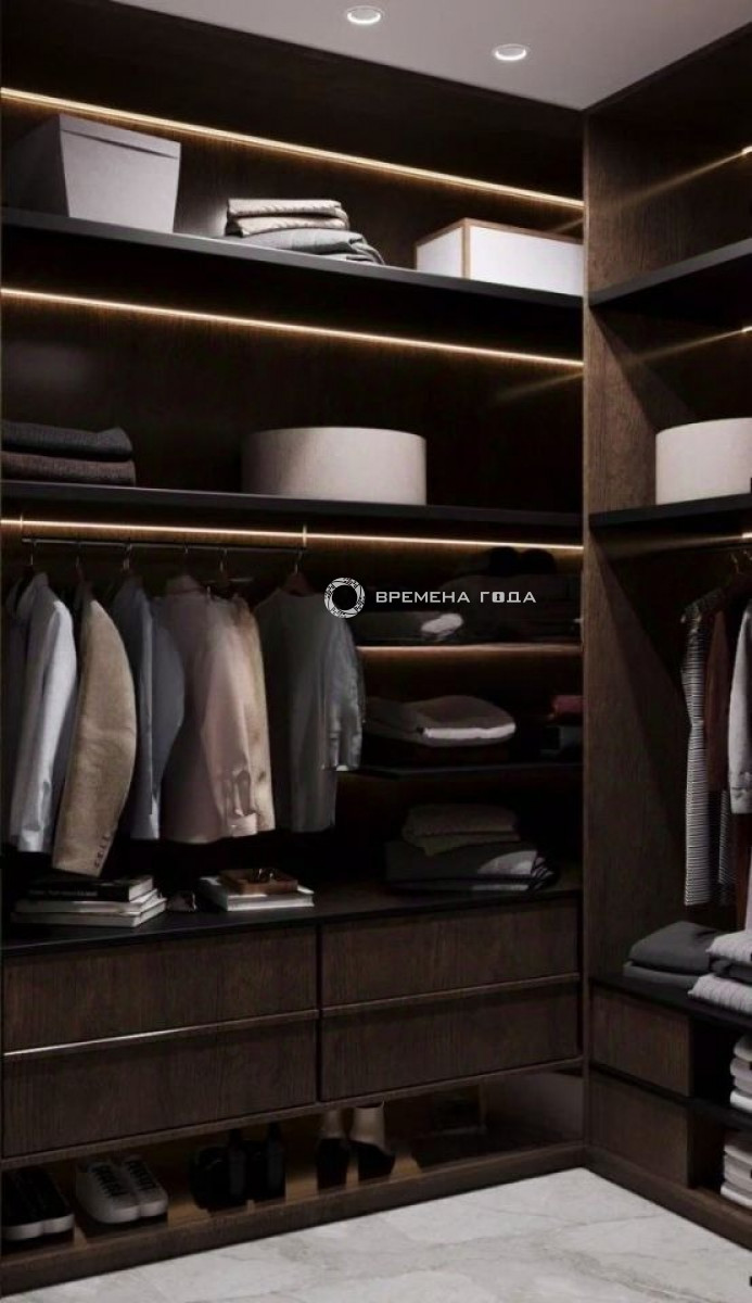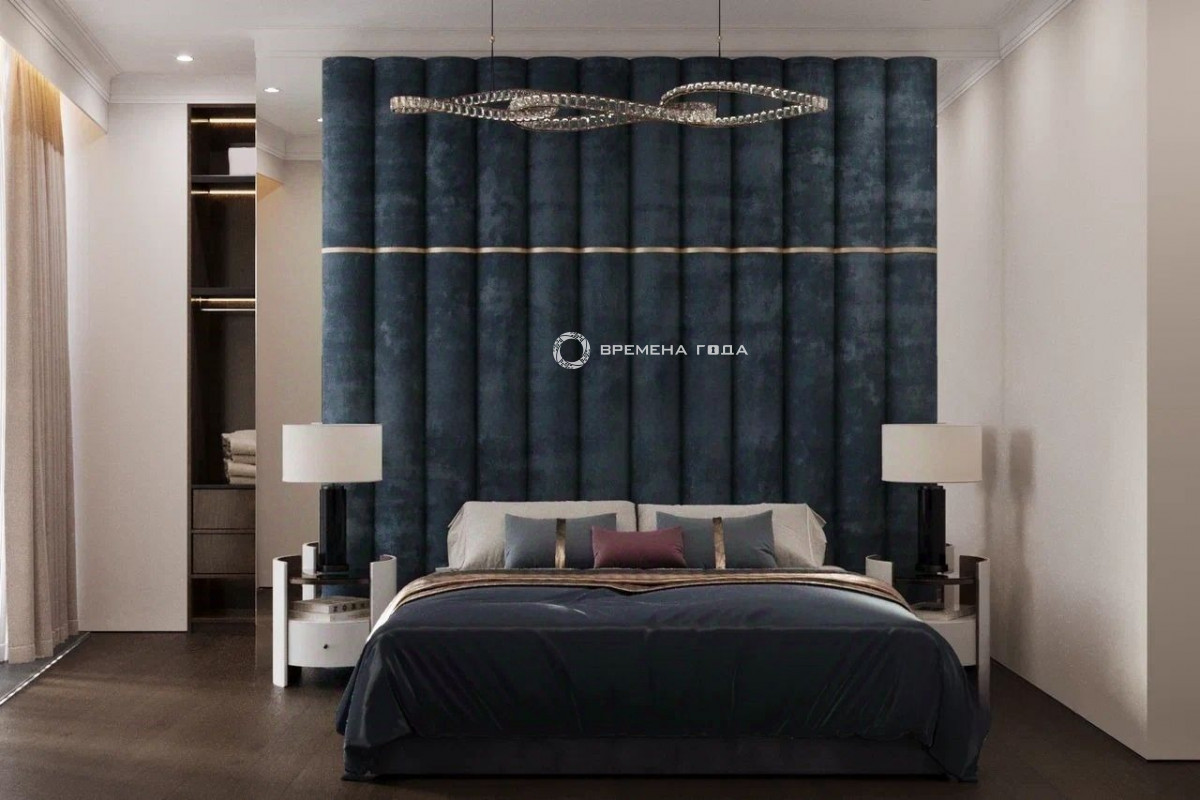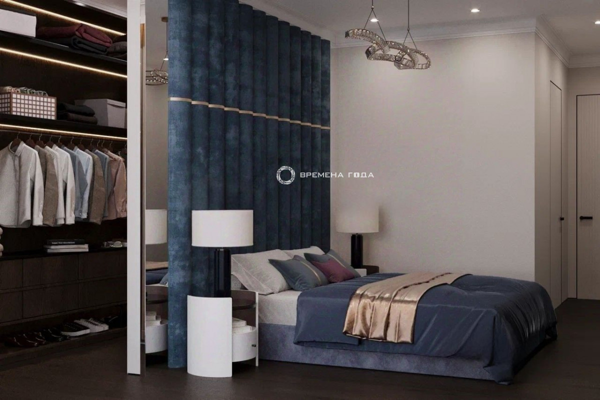 Планировочное решение: кухня с обеденной зоной и гостиной, столовая/кабинет, мастер-блок (спальня с гардеробной комнатой и своим санузлом), гостевая спальня, гостевой санузел, три гардеробные комнаты, постирочная комната