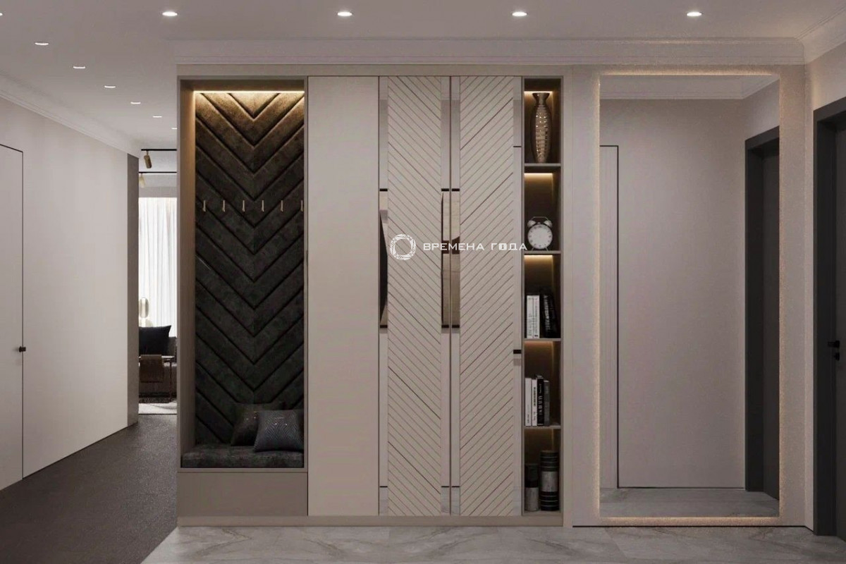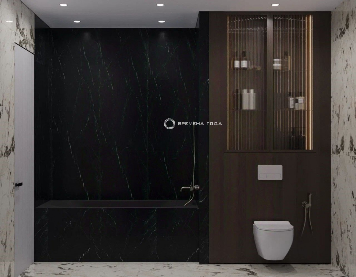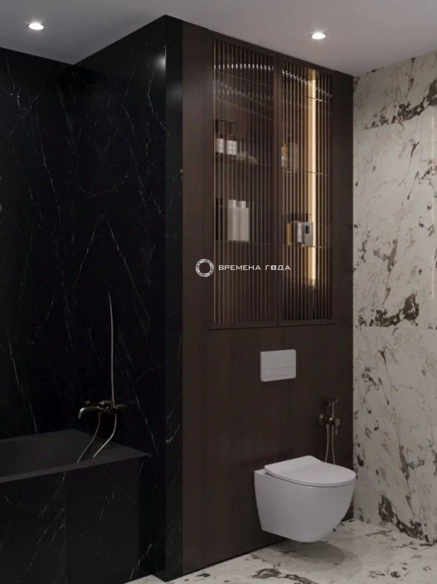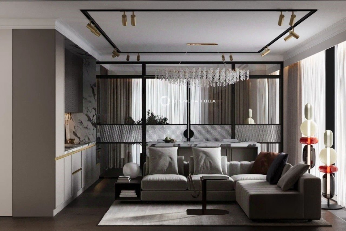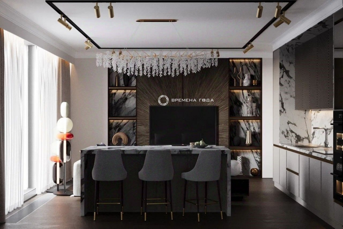 Планировочное решение: кухня с обеденной зоной и гостиной, столовая/кабинет, мастер-блок (спальня с гардеробной комнатой и своим санузлом), гостевая спальня, гостевой санузел, три гардеробные комнаты, постирочная комната