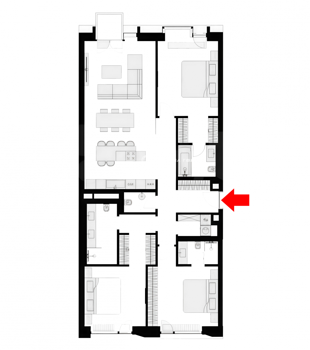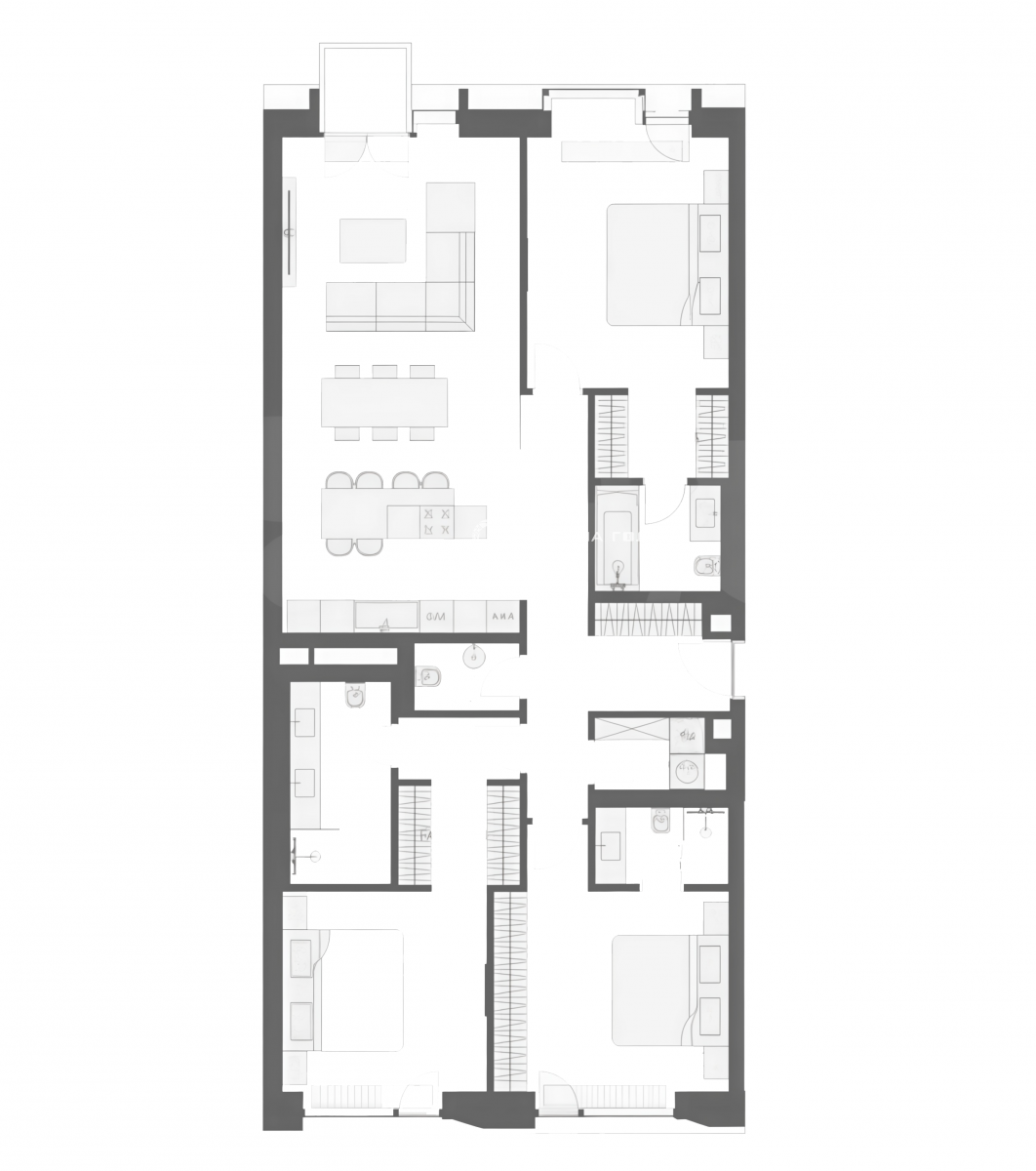 Планировочное решение: кухня с обеденной зоной и гостиной, две-мастер спальни со своими санузлами и гардеробными, спальня со своим санузлом, гостевой санузел, постирочная, прихожая.