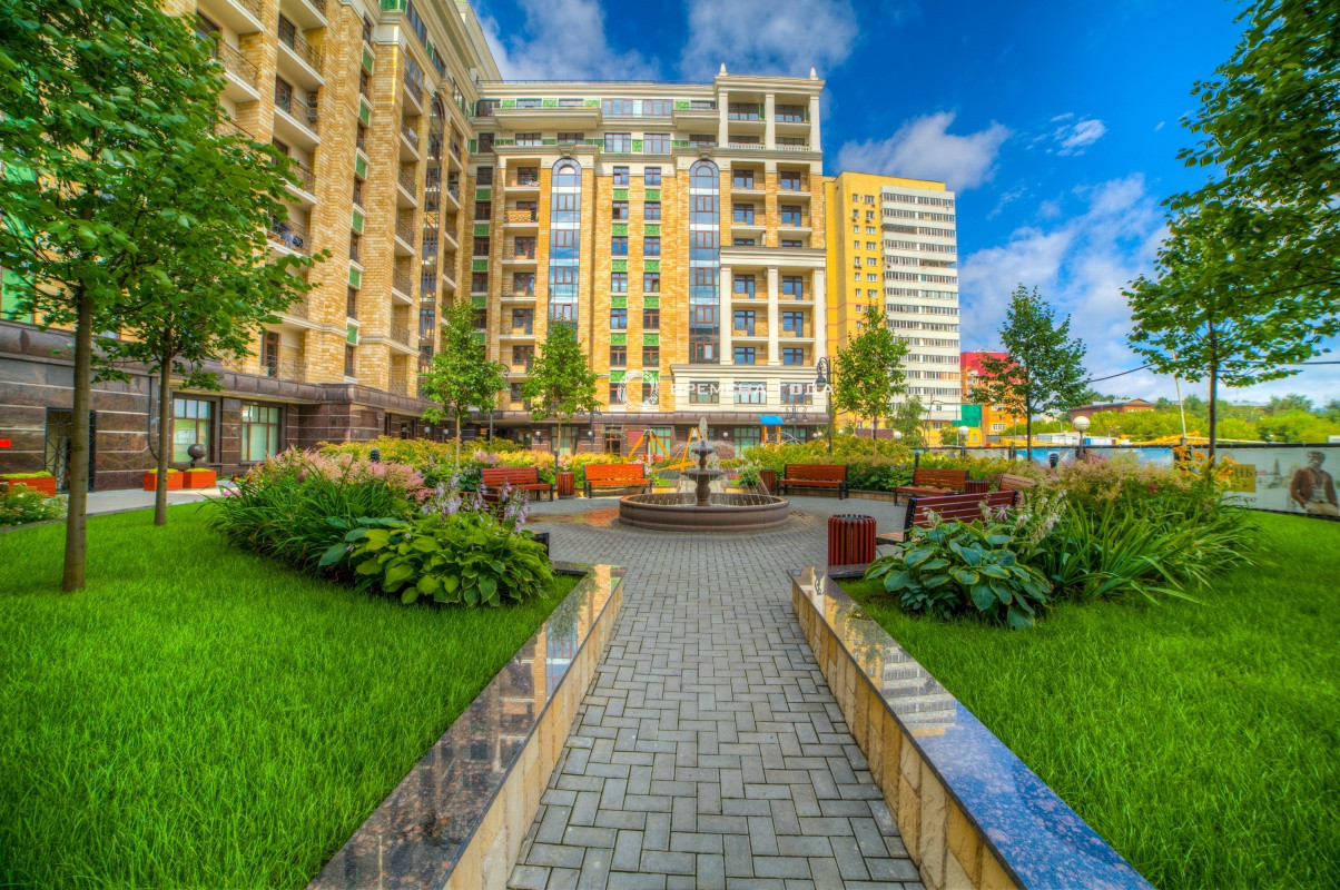 Фасад жилого комплекса «GRAND DELUX на Плющихе» отделан природным камнем. Основание дома оформлено плитами натурального гранита и массивными архитектурными элементами из камня.
