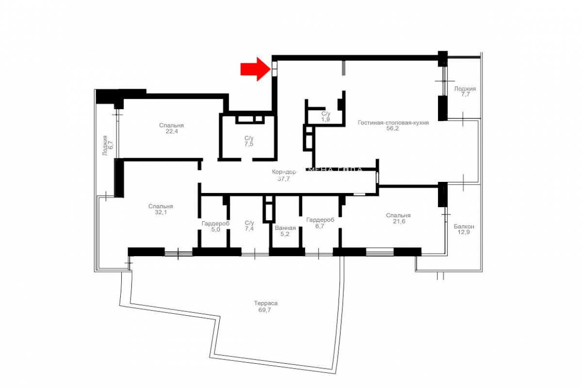 Свободная планировка: гостиная, кухня-столовая, 3-4 спальни, гардеробные, 3-4 санузла, 2 лоджии, балкон, терасса 70 м.
