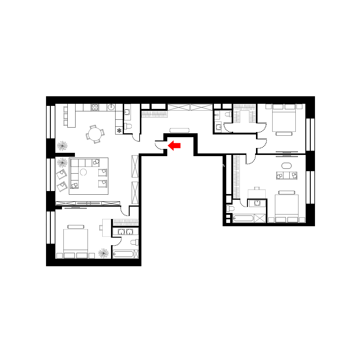 Возможный вариант планировки: кухня с обеденной зоной и гостиной, три спальни, четыре санузла, гардеробная комната, холл