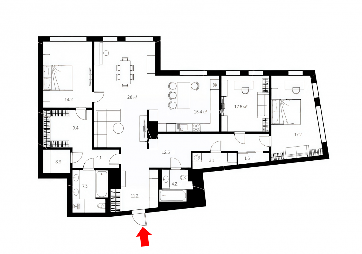 Планировка квартиры: кухня с обеденной зоной и гостиной, две спальни, два санузла, кабинет, холл