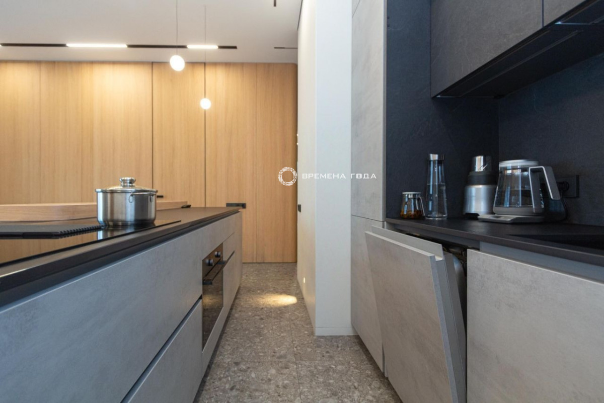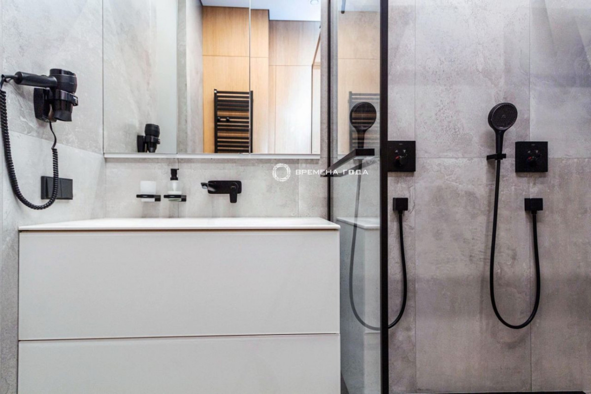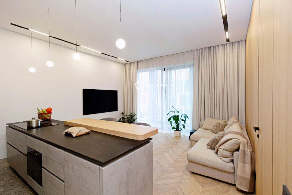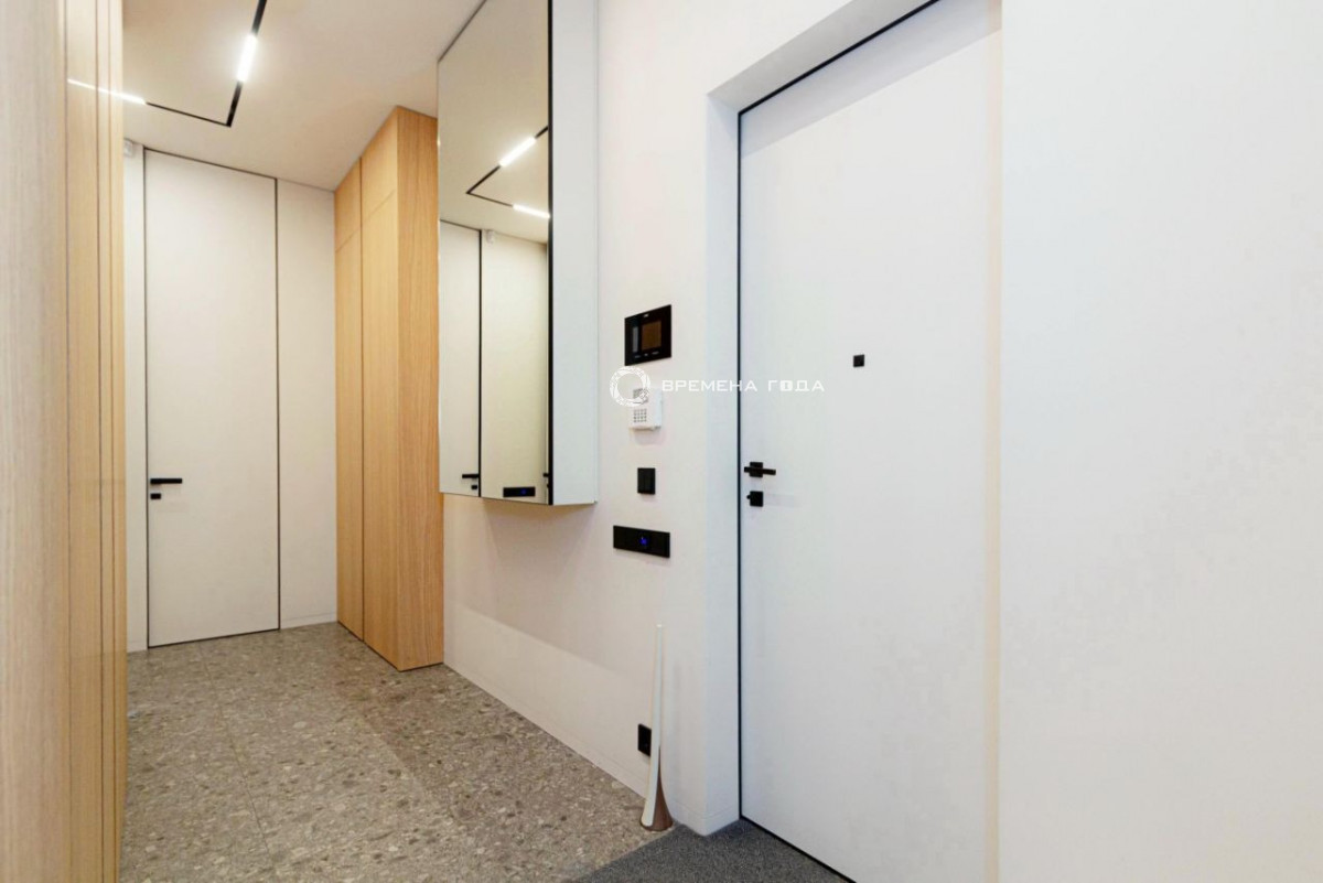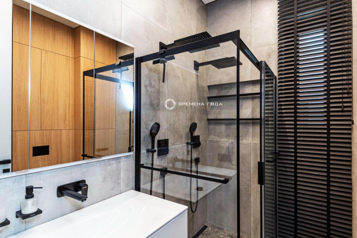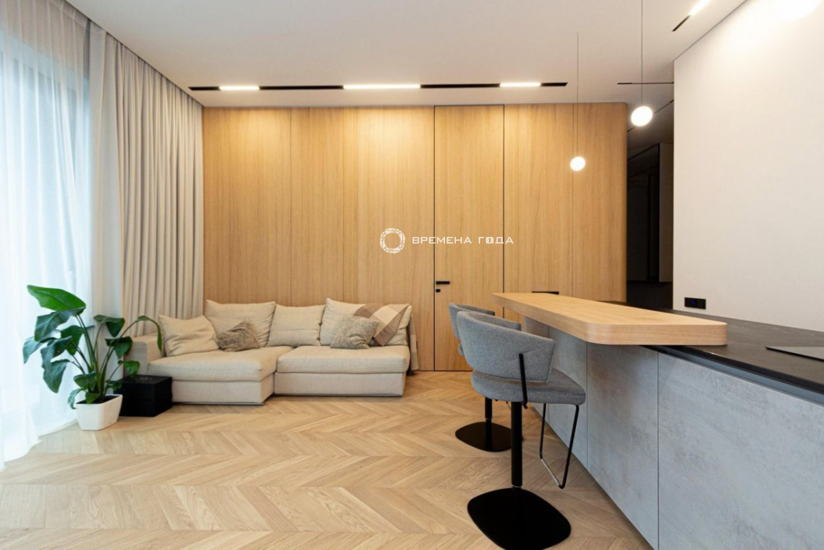 Планировочное решение: кухня с обеденной зоной и гостиной, две изолированные спальни, большой санузел с ванной и душевой, гостевой санузел, большое количество мест хранения, холл.