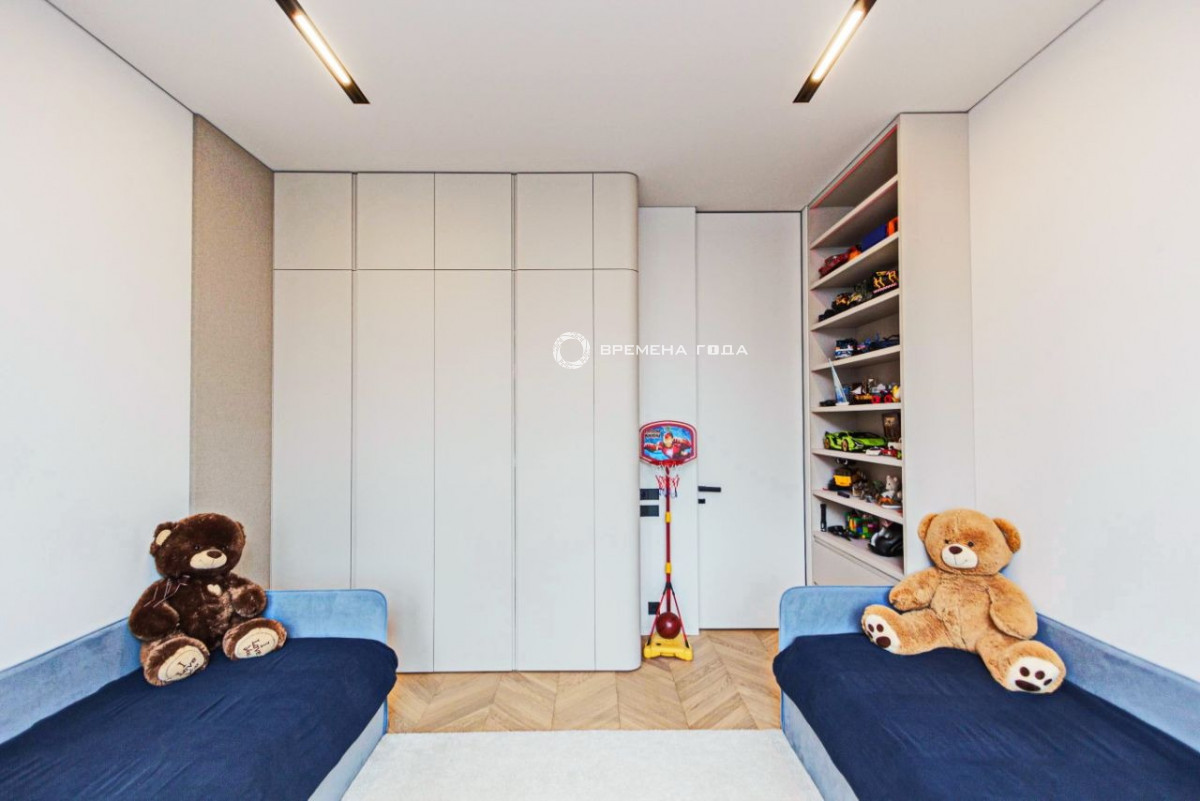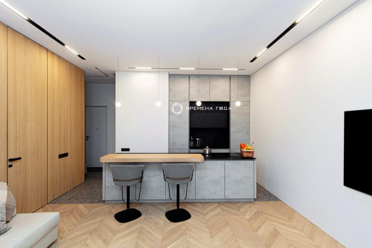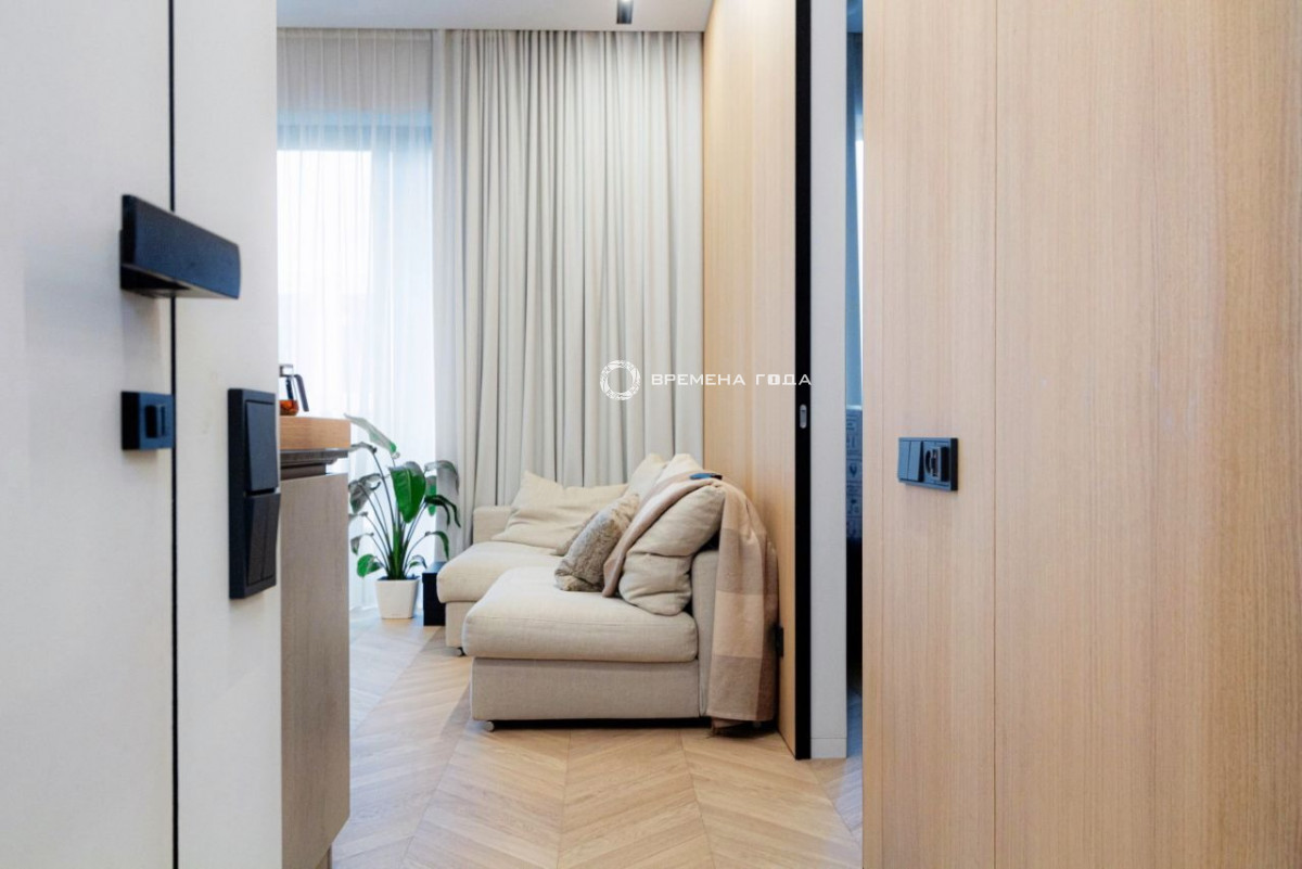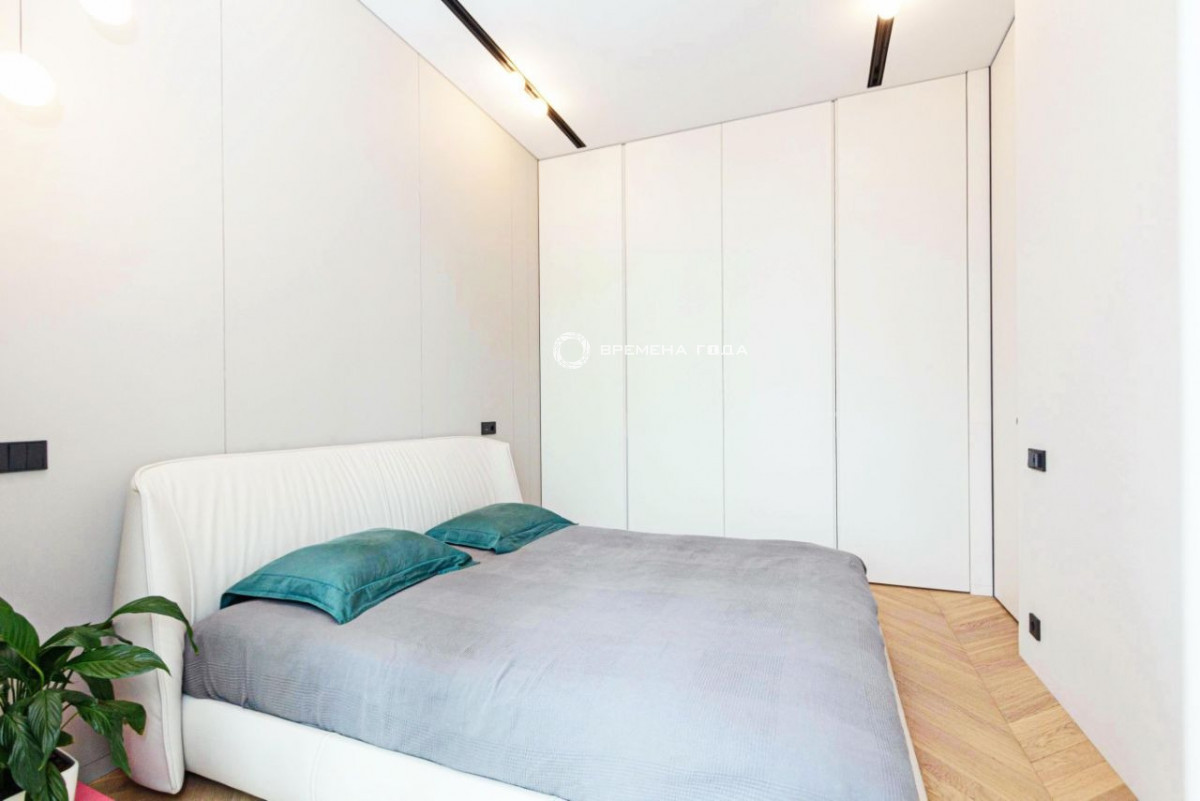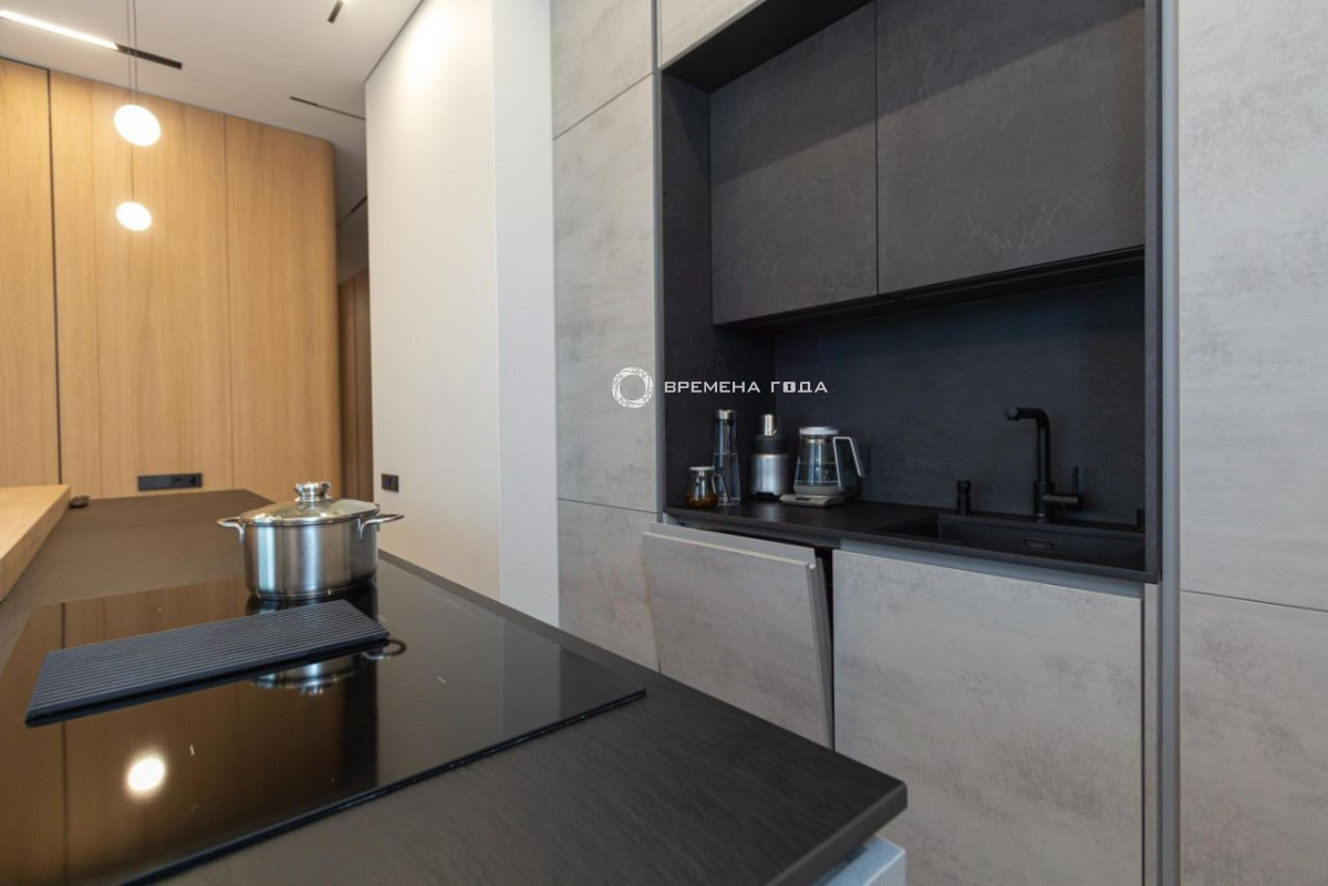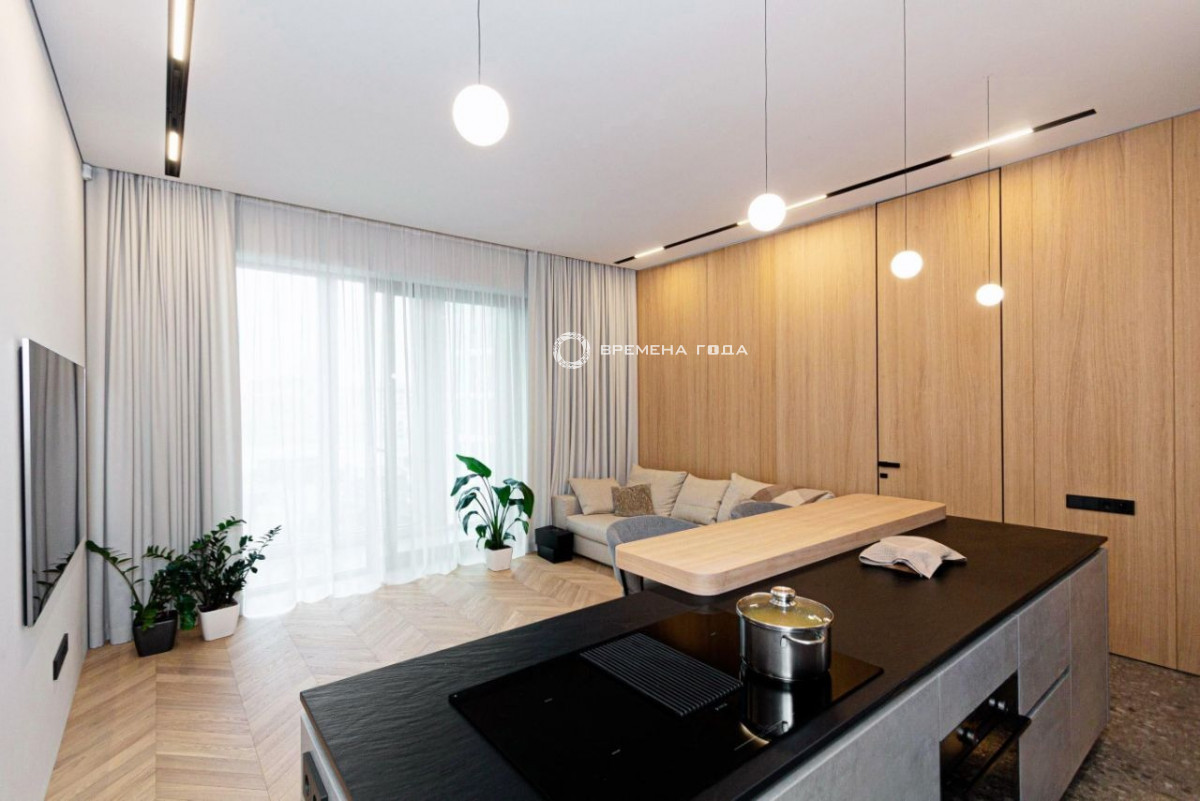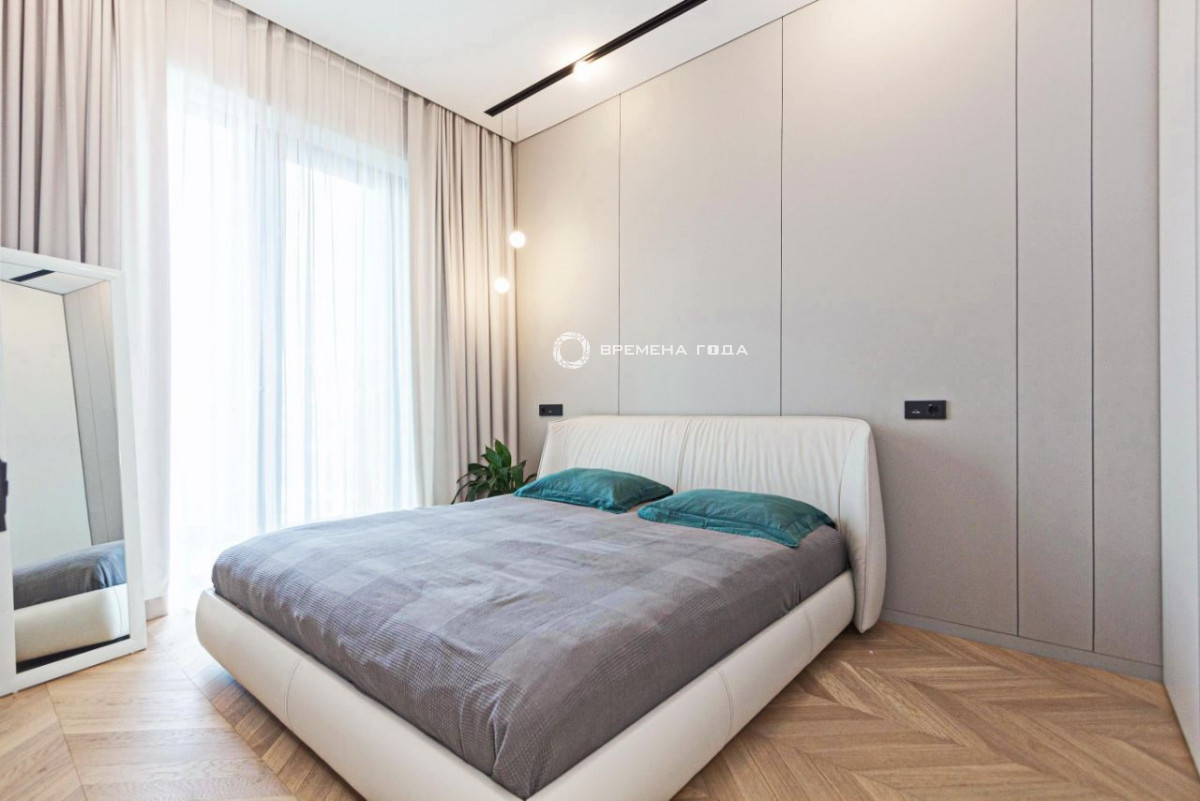 Планировочное решение: кухня с обеденной зоной и гостиной, две изолированные спальни, большой санузел с ванной и душевой, гостевой санузел, большое количество мест хранения, холл.