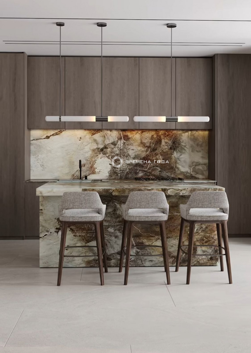 Планировочное решение: кухня с обеденной зоной и гостиной, мастер-спальня со своим санузлом и гардеробной, спальня со своим санузлом, гостевой санузел, прихожая.