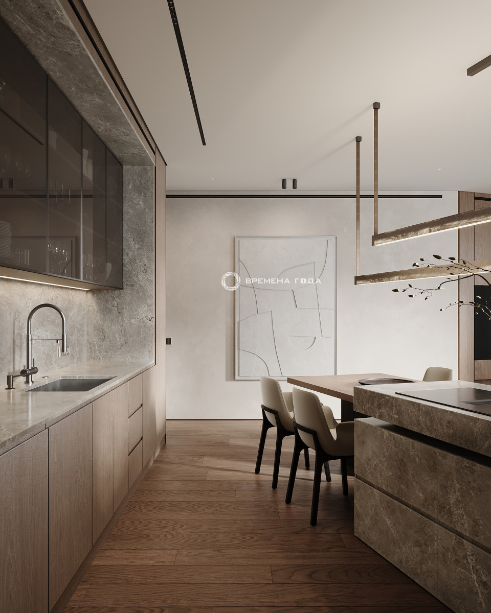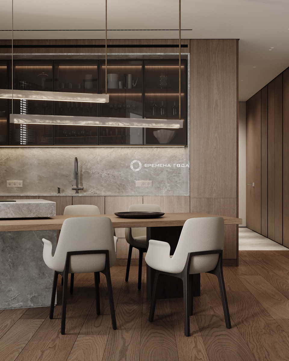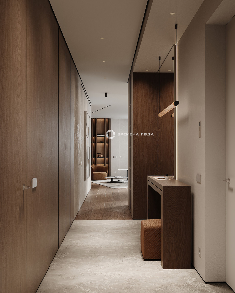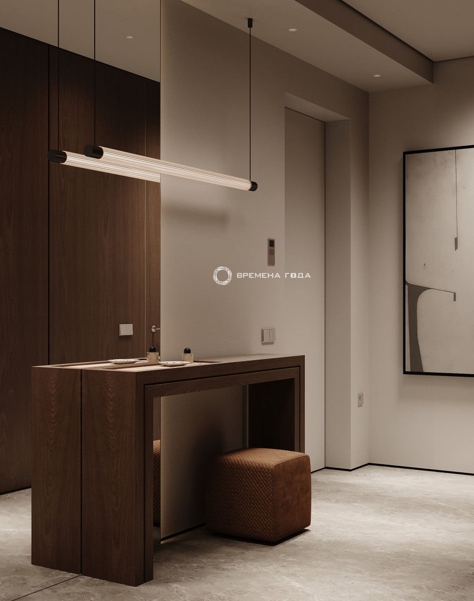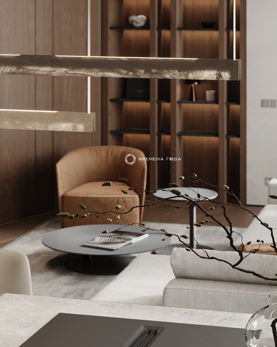 В квартире выполнена премиальная дизайнерская отделка с использованием высококачественных и натуральных материалов, таких как: натуральный мрамор, шпон дуба, сатинированная сталь, декоративная штукатурка.
