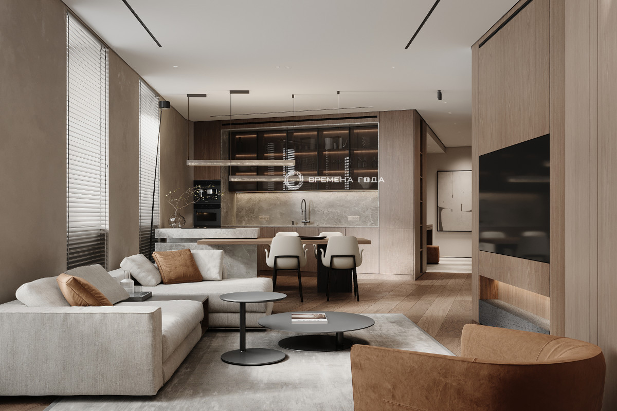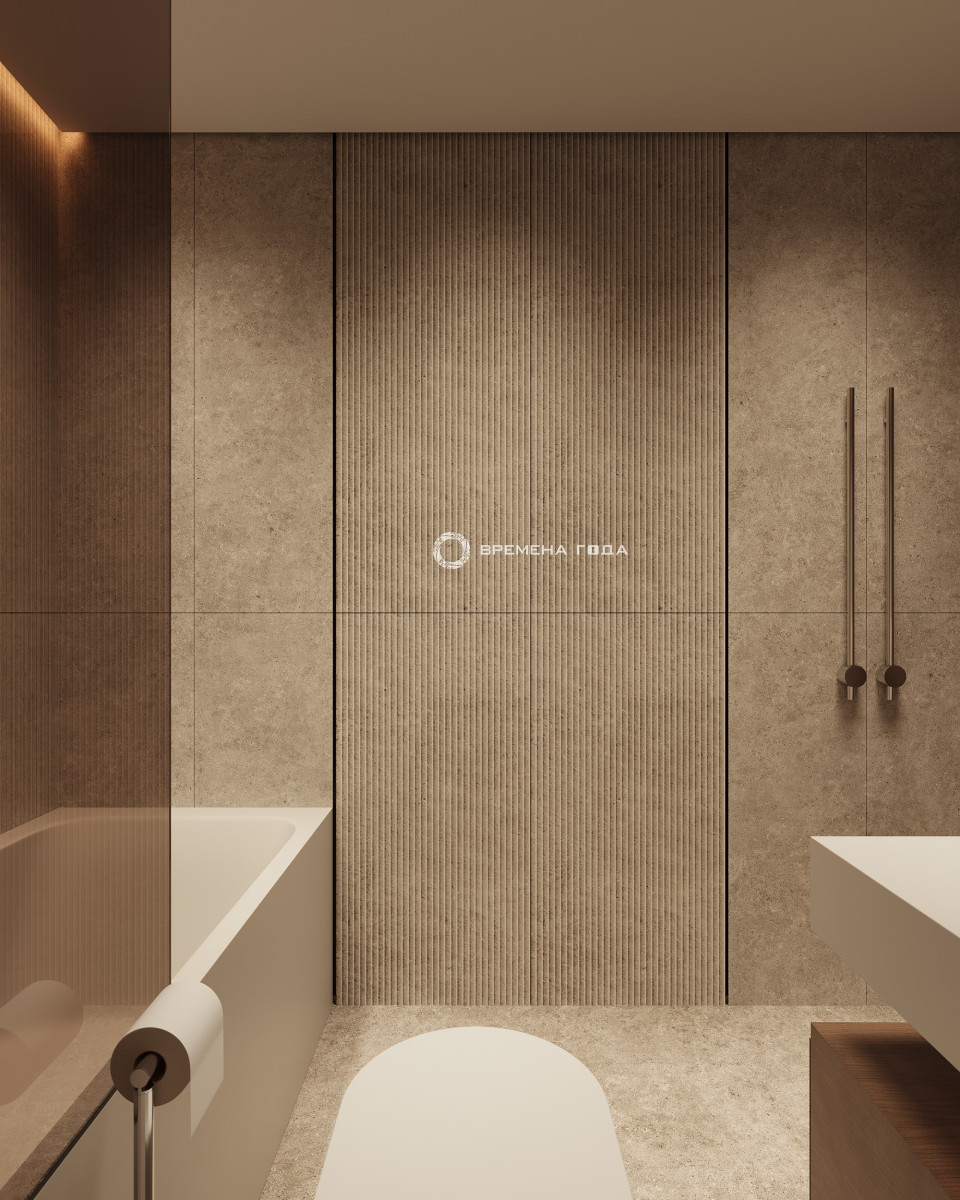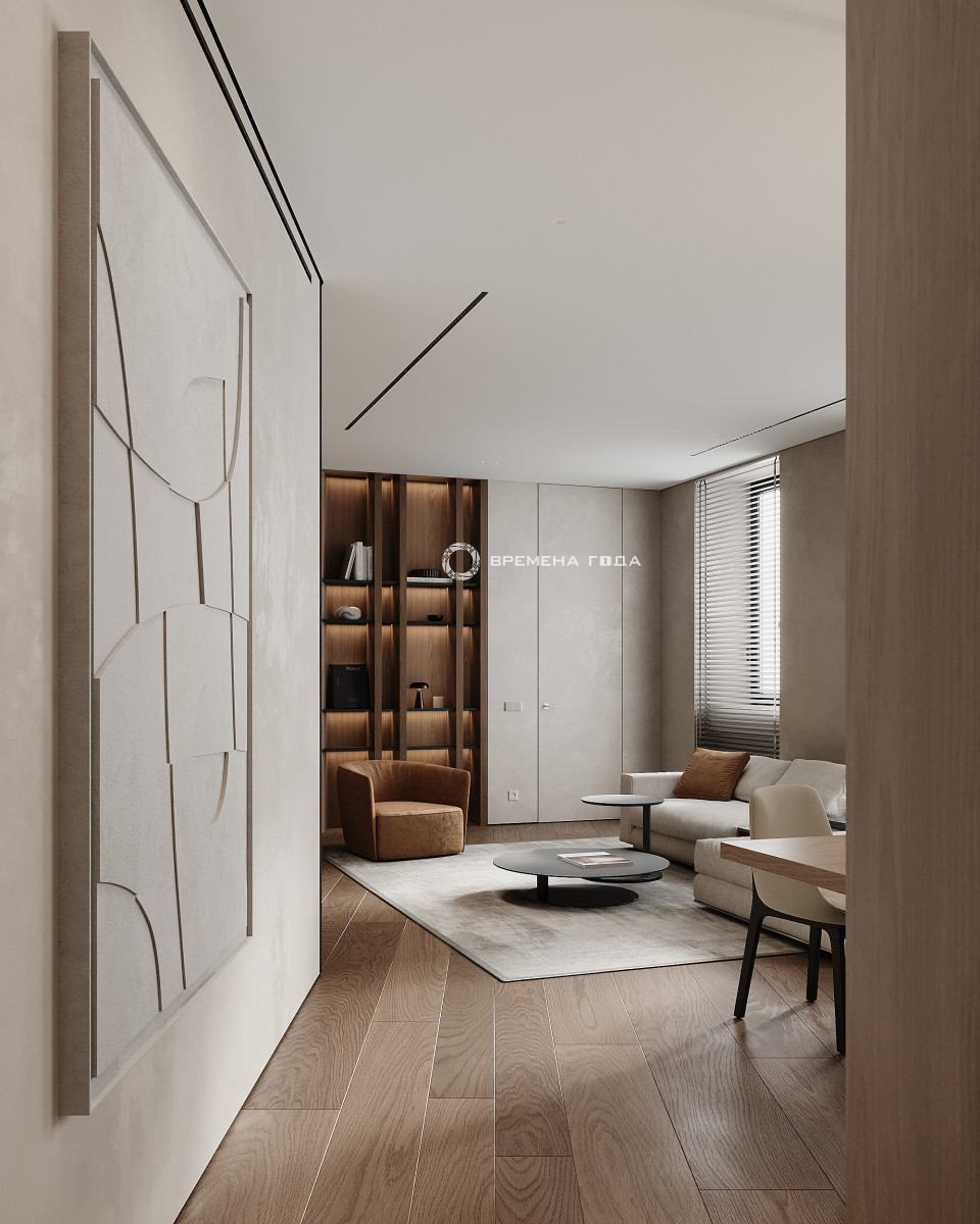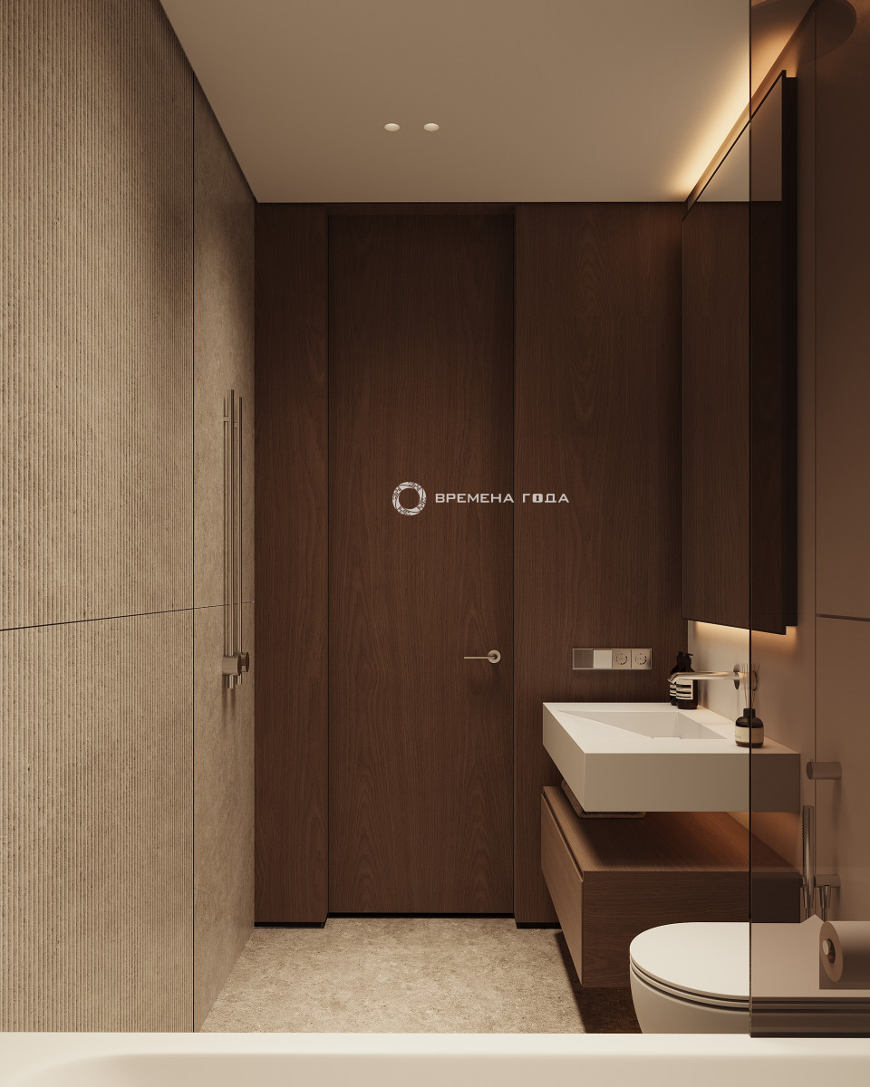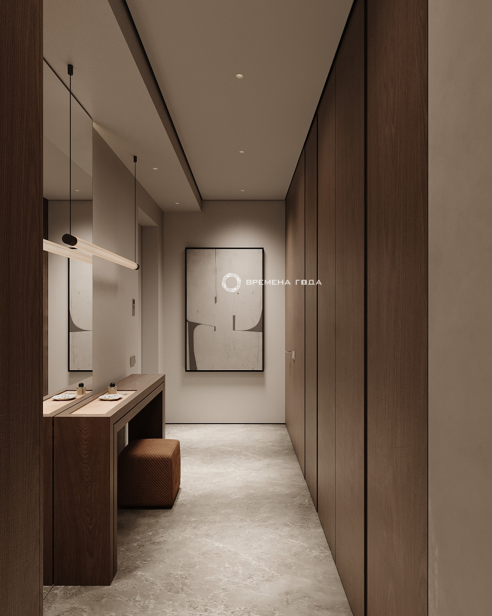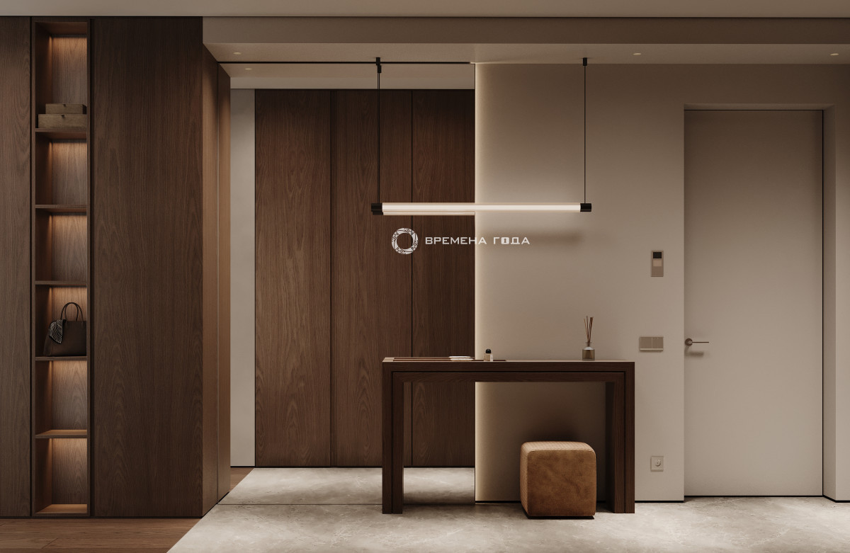 В квартире выполнена премиальная дизайнерская отделка с использованием высококачественных и натуральных материалов, таких как: натуральный мрамор, шпон дуба, сатинированная сталь, декоративная штукатурка.