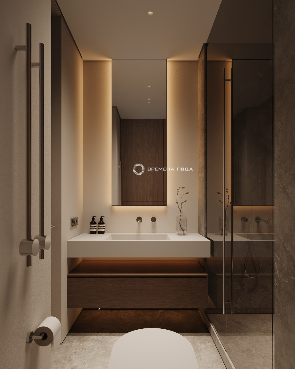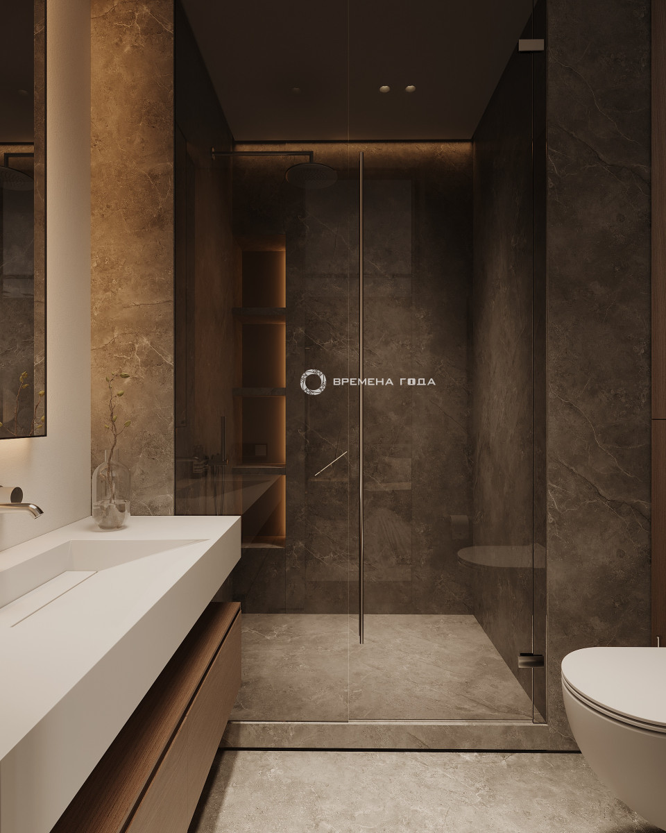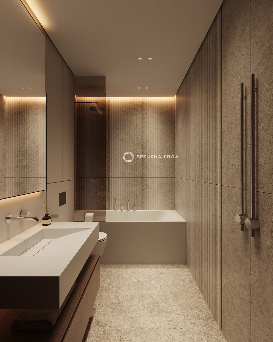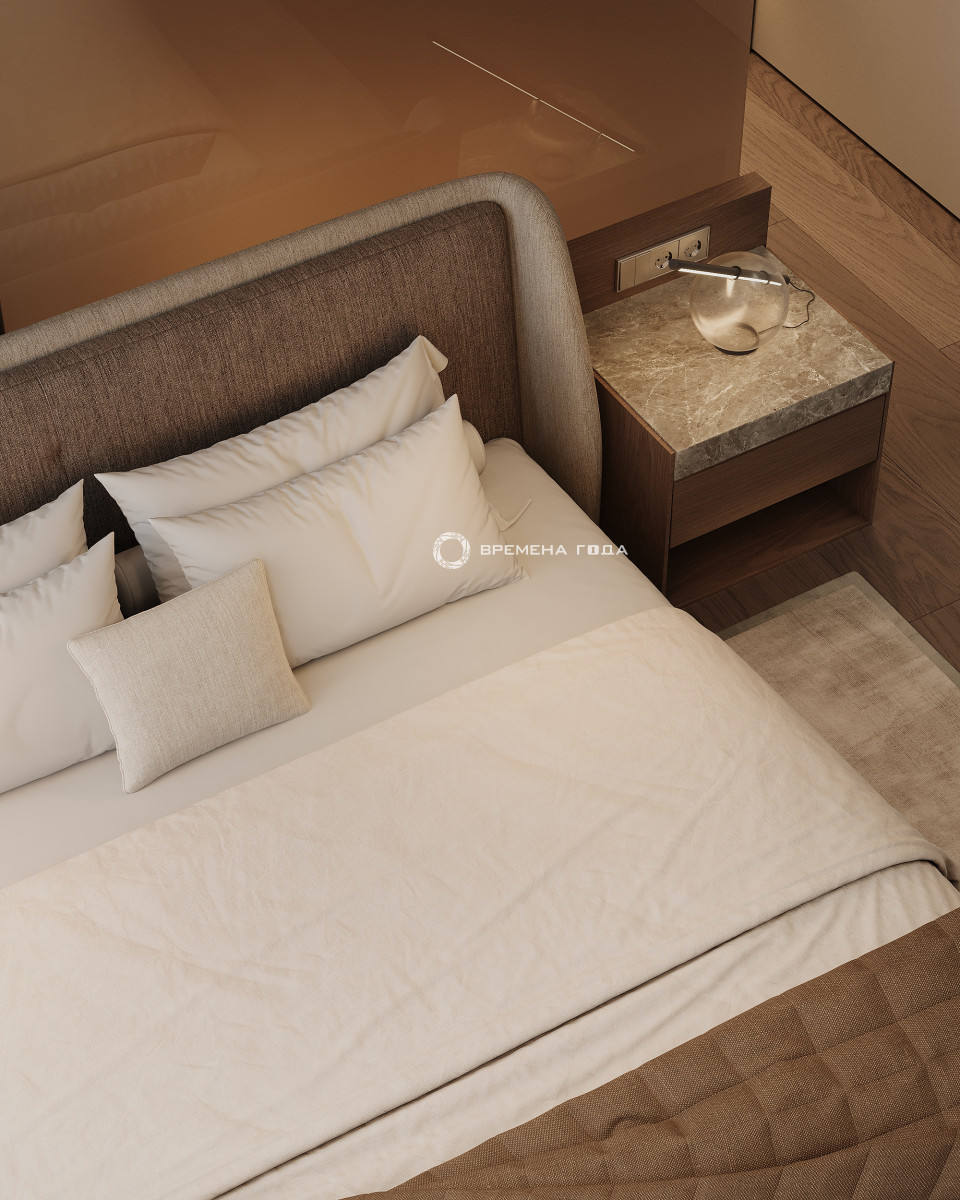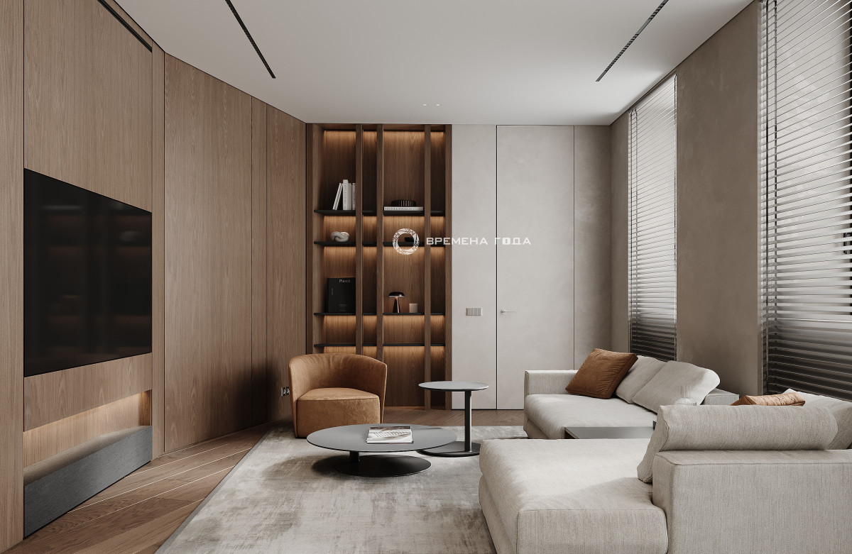 В квартире выполнена премиальная дизайнерская отделка с использованием высококачественных и натуральных материалов, таких как: натуральный мрамор, шпон дуба, сатинированная сталь, декоративная штукатурка.